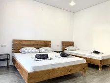Номера категории «Трехместный» идеально подходит как 1, так и 2-3 гостей. Удобные кровати односпальная и двуспальная с прикроватными столиками, ванная комната с душем - все что нужно для комфортного проживания. Просторный номер, архитектурное решение которого создает ощущение пространства и наполненности светом и воздухом.