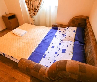 Номер стандарт семейный на втором этаже с балконом . Возможно размещение два человека + два . С/у в номере . Кровать двухспальная + диван на два спальных места