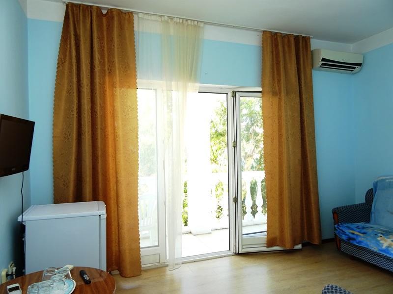 Мебель: односпальные или двуспальная кровати, стулья, шкаф, прикроватные тумбочки, журнальный столик, вешалка, зеркало. Удобства: кондиционер, холодильник, спутниковое ТВ, телевизор, посуда, интернет, балкон.