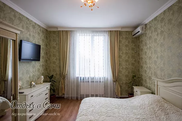 Мебель: двухспальная кровать, шкаф, стулья, прикроватные тумбочки, журнальный столик, комод, вешалка, зеркало. Удобства: сплит-система, телевизор, холодильник, интернет, фен.