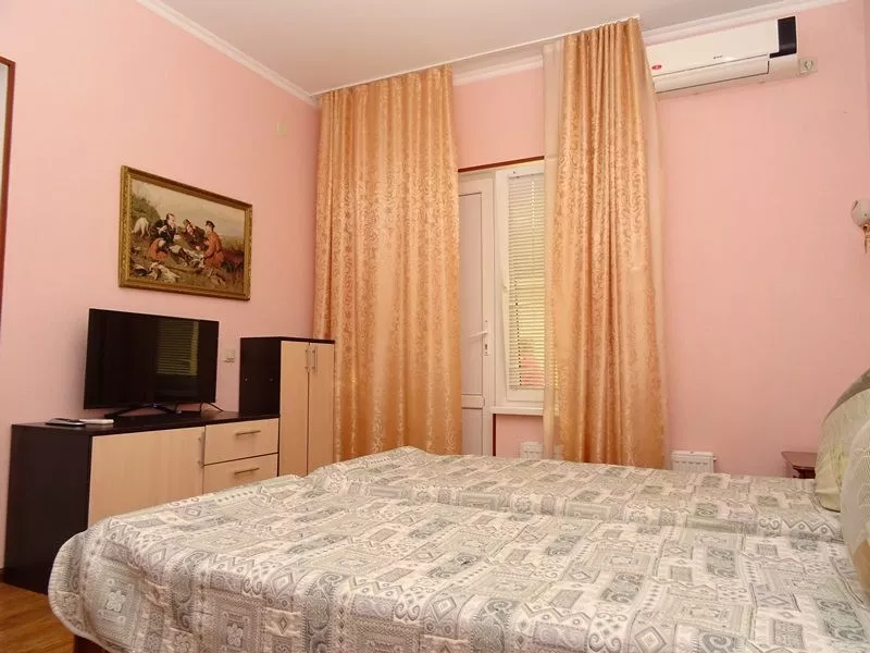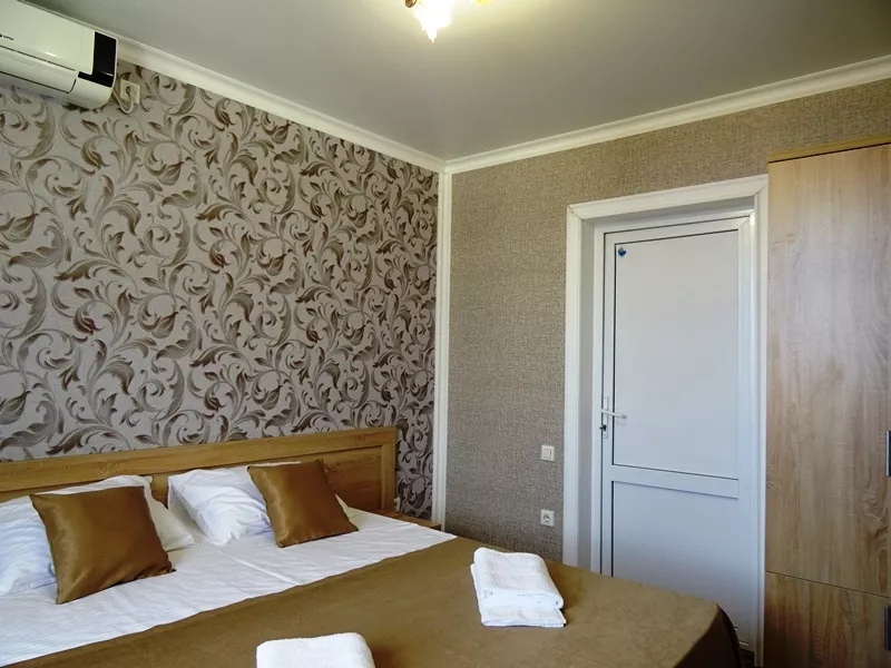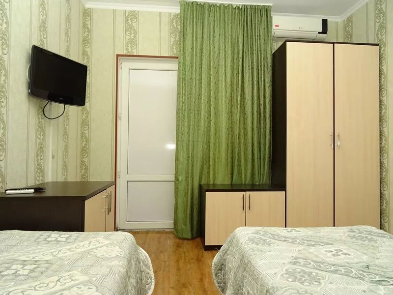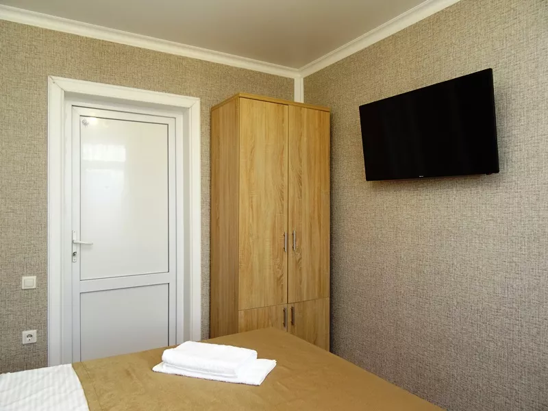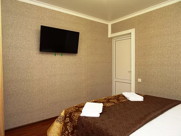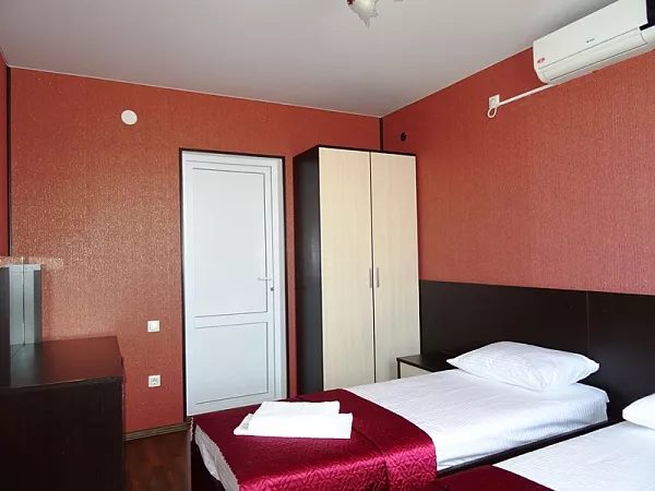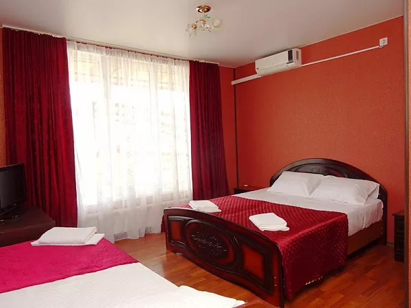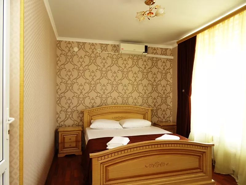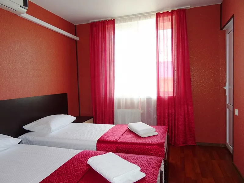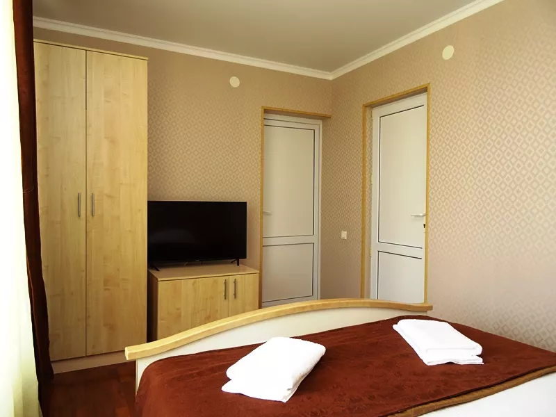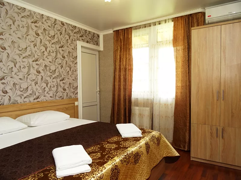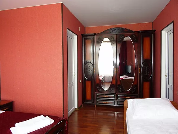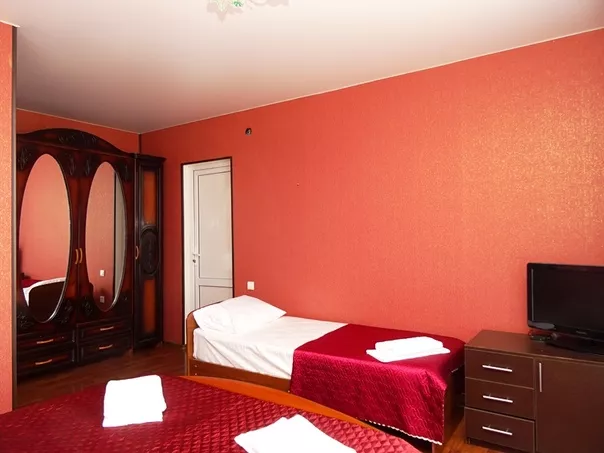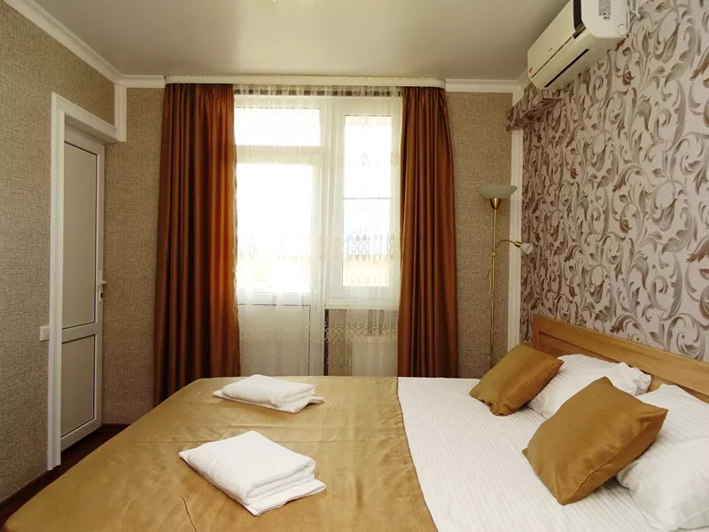 Мебель: односпальные или двуспальная кровати, шкаф, стулья, прикроватные тумбочки, журнальный столик, стол, туалетный столик, комод, прихожая, вешалка, зеркало. Удобства: кондиционер, телевизор, спутниковое ТВ, холодильник, СВЧ, посуда, фен, балкон (наличие уточнять).