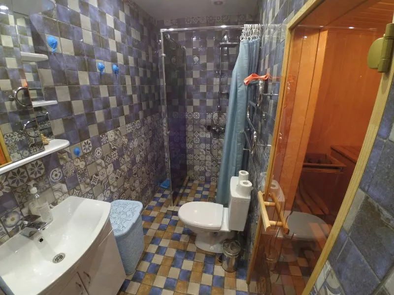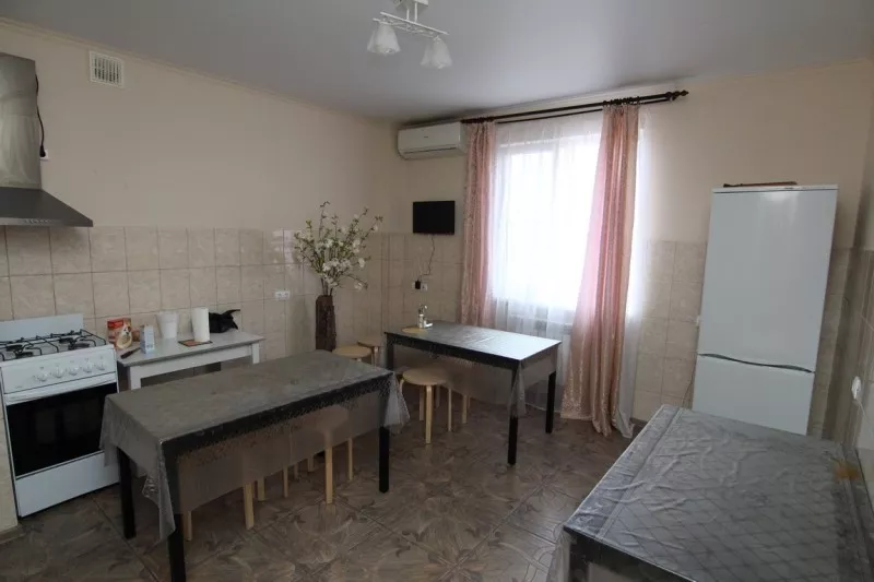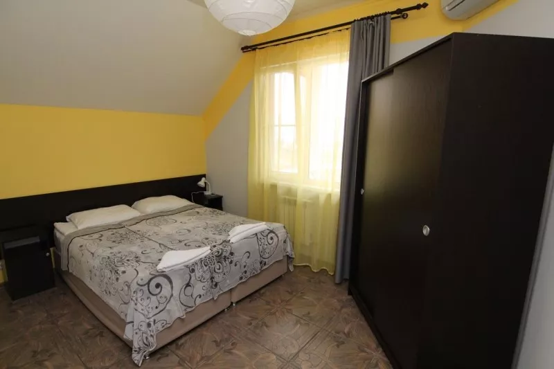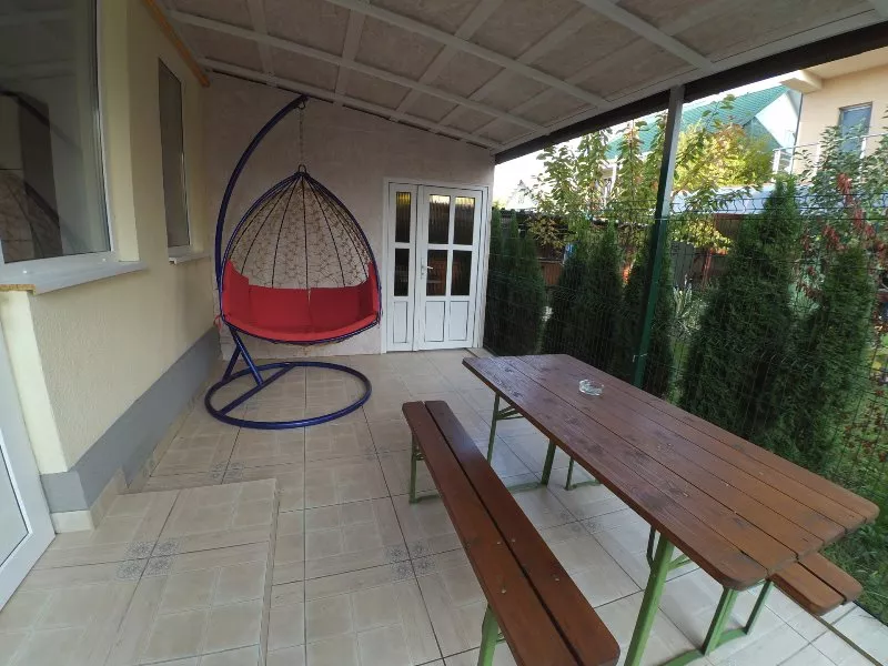 Мебель: двуспальная кровать, диван, шкафы, стулья, прикроватные тумбочки, стол, вешалка, зеркало, обеденная зона, кухонный гарнитур. Удобства: кондиционер, телевизор, ТВ, интернет, холодильник, фен, эл. чайник, посуда, индивидуальный двор, качели, сауна.