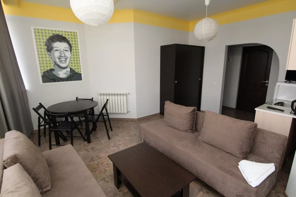 Мебель: односпальные или двуспальная кровати, диван-кровать, шкаф, стулья, прикроватные тумбочки, журнальный столик, стол, прихожая, вешалка, зеркало, кухонный гарнитур, обеденная зона. Удобства: кондиционер, телевизор, ТВ, интернет, холодильник, фен, эл. чайник, посуда, балкон.
