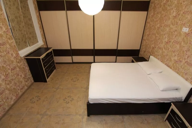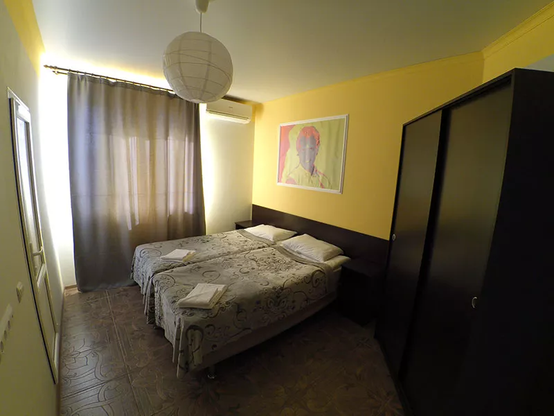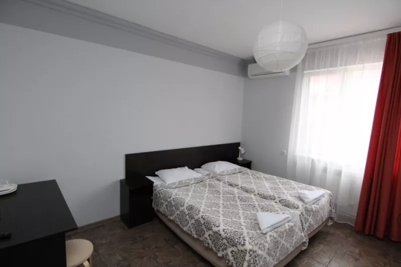 Мебель: односпальные или двуспальная кровати, шкаф, стулья, прикроватные тумбочки, стол, вешалка, зеркало. Удобства: кондиционер, телевизор, ТВ, интернет, холодильник, фен, эл. чайник, посуда, балкон (наличие уточнять).