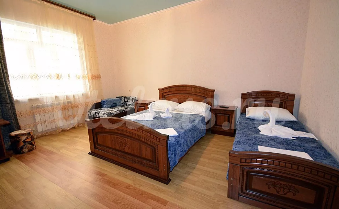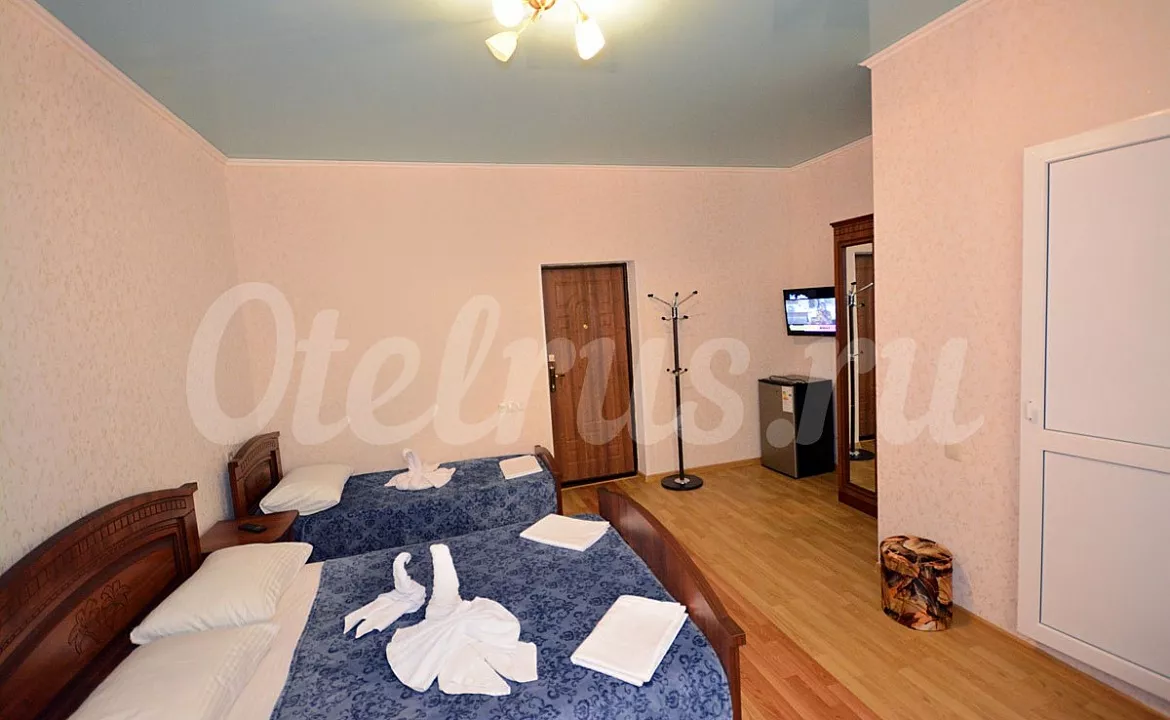 Мебель: двуспальная кровать, диван-кровать, шкаф, стулья, прикроватные тумбочки, журнальный столик, вешалка, зеркало. Удобства: кондиционер, холодильник, телевизор, спутниковое ТВ, интернет, эл. чайник, посуда, балкон (наличие уточнять).