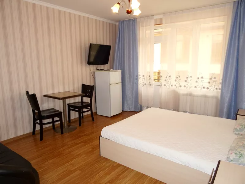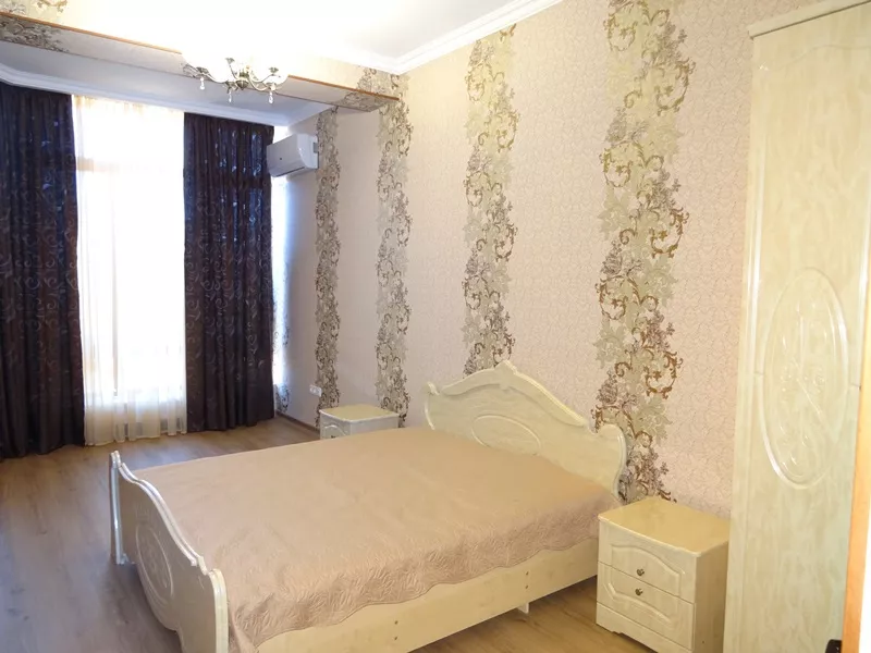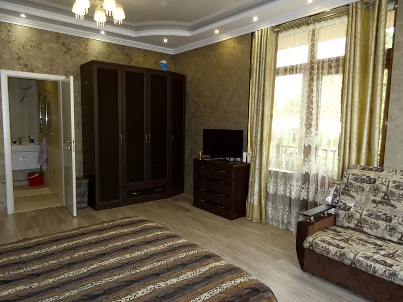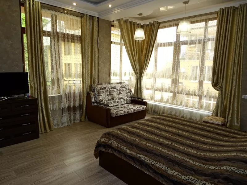 Мебель: двуспальная кровать, диван-кровать, кресло-кровать, шкаф, кресла, прикроватные тумбочки, туалетный столик, прихожая, вешалка, зеркало, кухонный гарнитур, обеденная зона. Удобства: кондиционер, телевизор, спутниковое ТВ, интернет, холодильник, СВЧ, фен, эл. чайник, посуда, балкон.