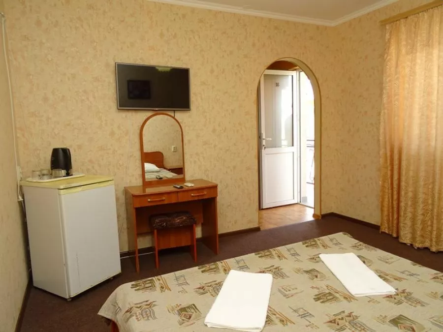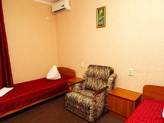 Мебель: двуспальная кровать, 2 односпальные кровати, шкаф, прикроватные тумбочки, журнальный столик, вешалка, зеркало. Удобства: кондиционер, телевизор, интернет, холодильник, эл. чайник, посуда.