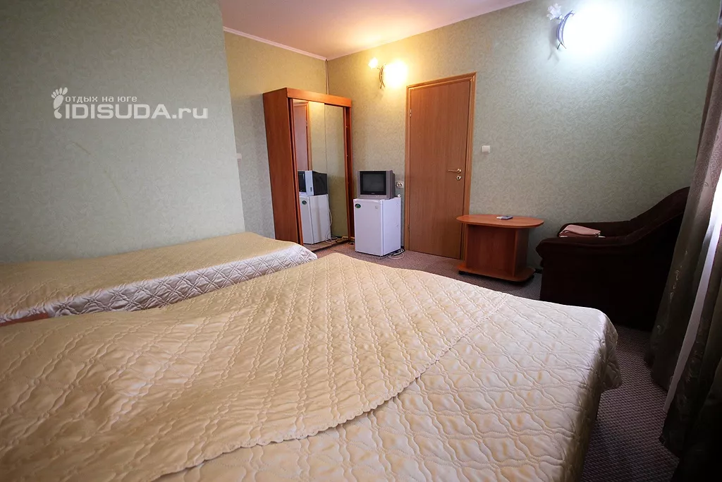 Мебель: односпальные или двуспальная кровати, кресло-кровать, шкаф, прикроватные тумбочки, журнальный столик, вешалка, зеркало, уличная мебель. Удобства: кондиционер, холодильник, телевизор, спутниковое ТВ, интернет, балкон.