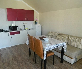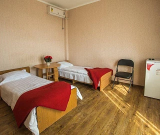 Мебель: 2 односпальные или двуспальная кровати, шкаф, стулья, стол, зеркало. Удобства: кондиционер, телевизор, спутниковое ТВ, интернет, холодильник, эл. чайник, фен, сейф у администратора, мыло, гель для душа, комплект индивидуальной косметики: зубная щетка и паста (при заезде), шапочка для душа, тапочки.