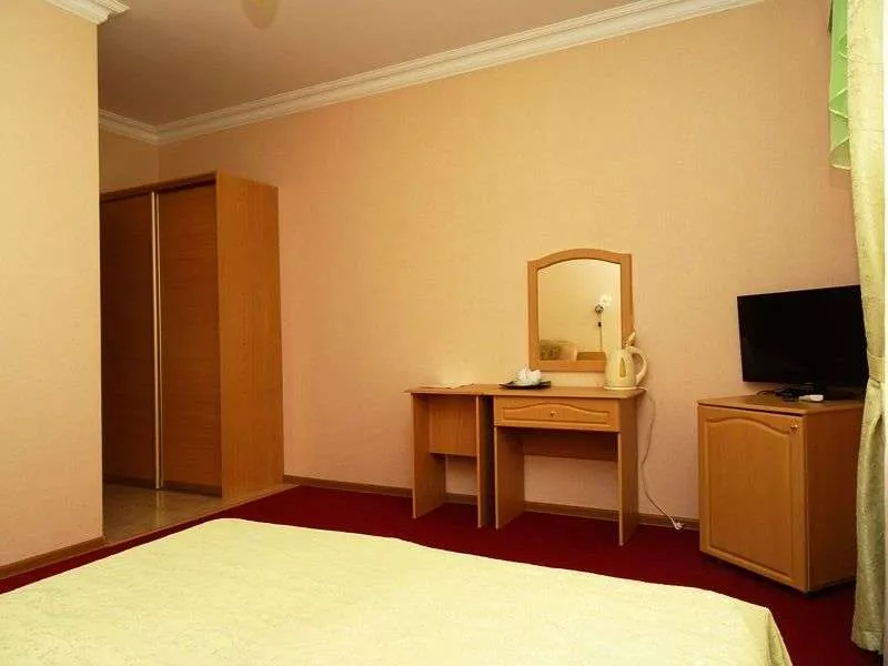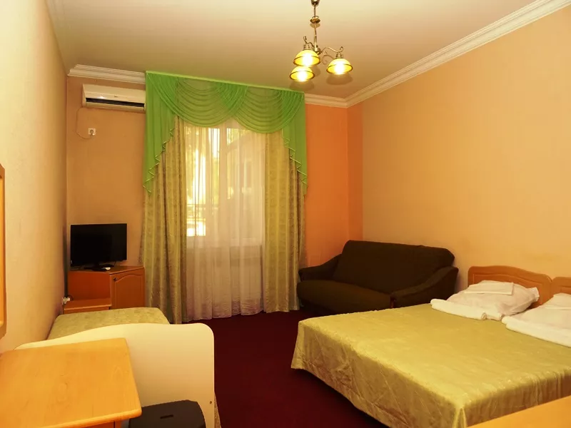 Мебель: односпальные или двуспальная кровати, кресло-кровать, шкаф, стулья, прикроватные тумбочки, журнальный столик, прихожая, вешалка, зеркало. Удобства: кондиционер, телевизор, спутниковое ТВ, холодильник, фен, эл. чайник, посуда, балкон