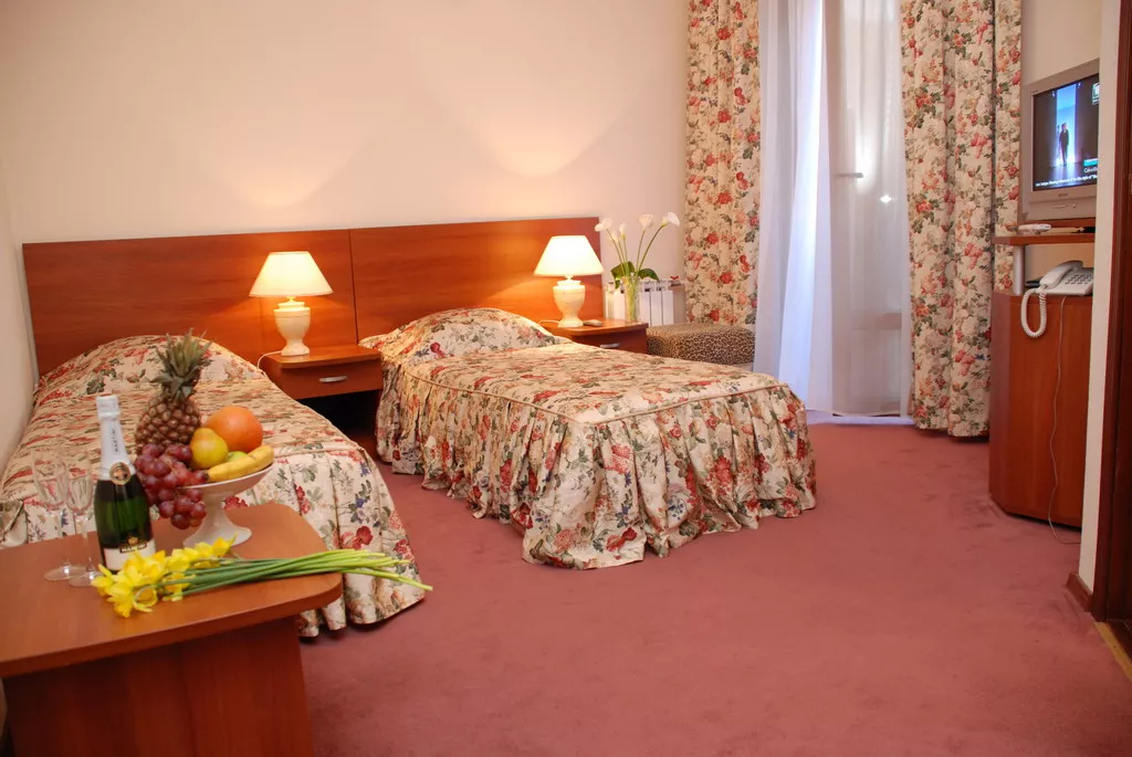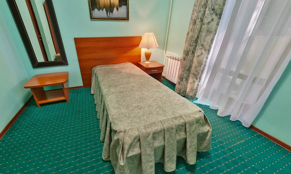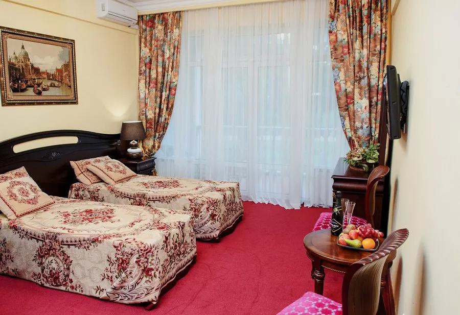 Санузел+Душ: в номере (ванная с душевой кабиной). Мебель: двуспальная кровать, шкаф, стулья, прикроватные тумбы, журнальный столик, вешалки. Удобства: кондиционер, телевизор, телефон, холодильник, эл. чайник, фен, посуда, комплект полотенец, балконы (не во всех номерах)