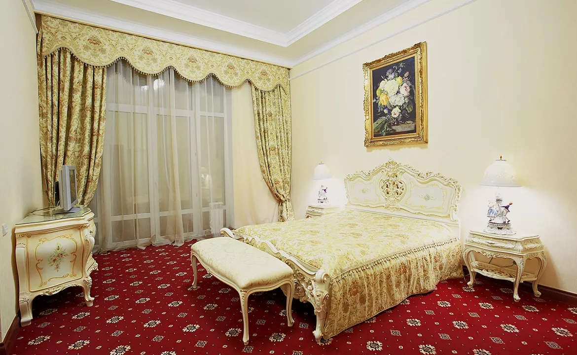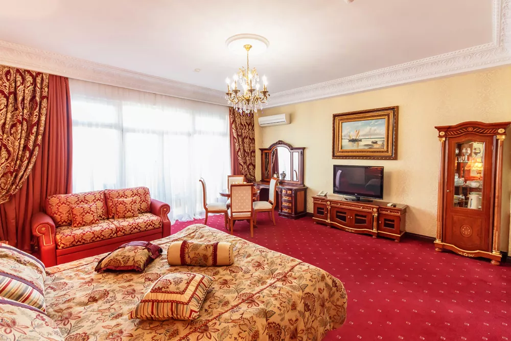 Санузел+Душ: в номере (ванная с душевой кабиной или гидромассажной ванной). Мебель: двуспальная кровать, диван, шкаф, стулья, прикроватные тумбы, журнальный столик, туалетный столик, вешалки, ротанговая мебель на балконе. Удобства: кондиционер, телевизор, телефон, холодильник, эл. чайник, фен, посуда, комплект полотенец, халаты, тапочки, косметические принадлежности, гладильная + утюг, сушилка, балкон.