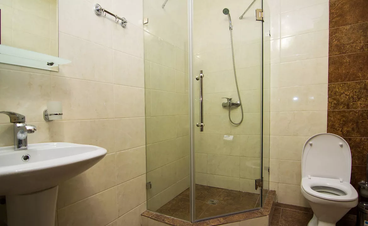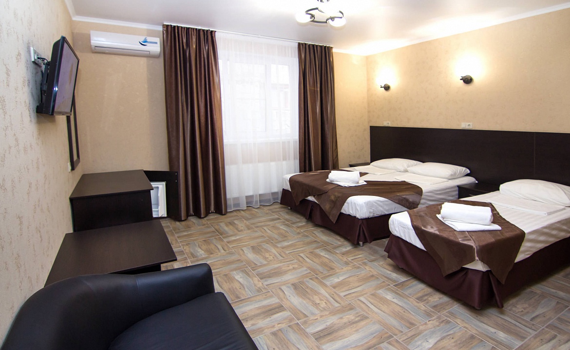 "Трехместный номер" - 22 кв.м с удобствами-(душ+туалет). Номер оборудован: 1 двуспальной кроватью + 1 односпальной кроватью или (3 односпальными кроватями) , шкафом для одежды, журнальным и письменным столом, тумбочками, ТВ, холодильником,кондиционером