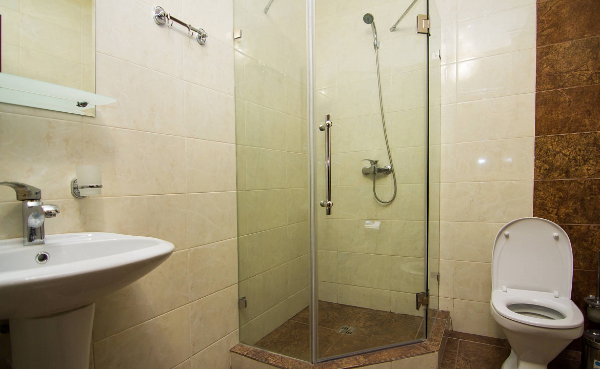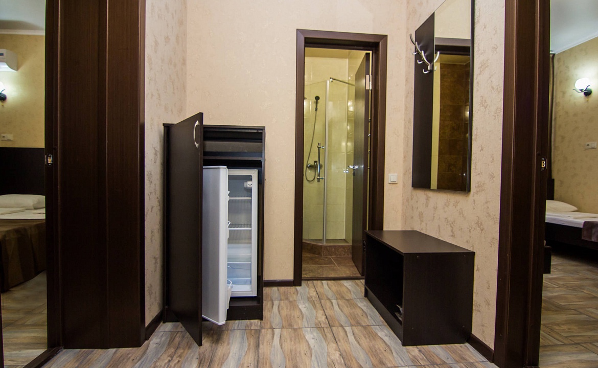 " Двухкомнатный номер "- 32 кв.м с удобствами-(душ+туалет Номер оборудован: двуспальной кроватью + 2 односпальные ,шкафом для одежды, журнальным и письменным столом, тумбочками, ТВ,