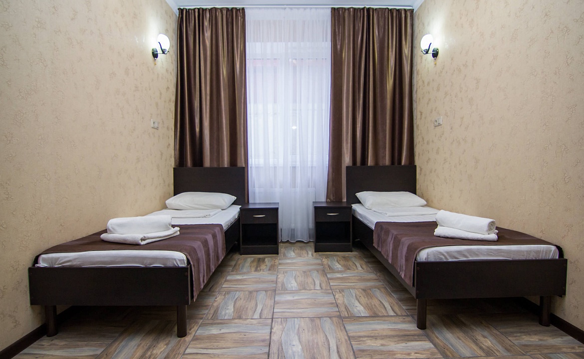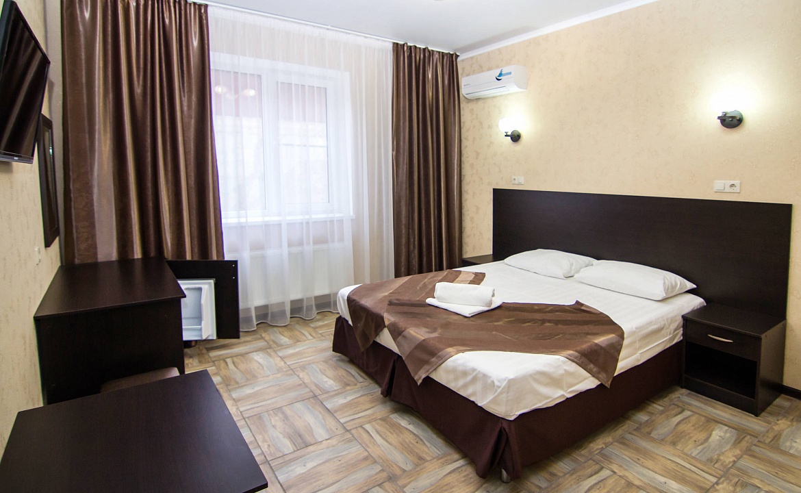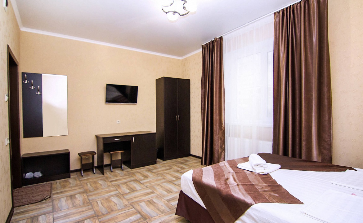"Двухместный номер" - 17кв.м с удобствами в номере- (душ+туалет) Номер оборудован: двуспальной кроватью, шкафом для одежды, журнальным и письменным столом, тумбочками, ТВ, холодильником, кондиционером.