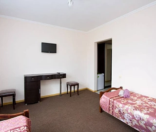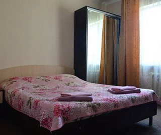 Мебель: односпальные или двуспальная кровати, шкаф-купе, пуфики, прикроватные тумбочки, журнальный столик, туалетный столик. Удобства: сплит-система, телевизор, холодильник, интернет.