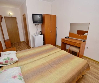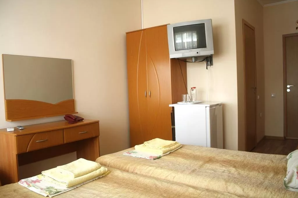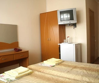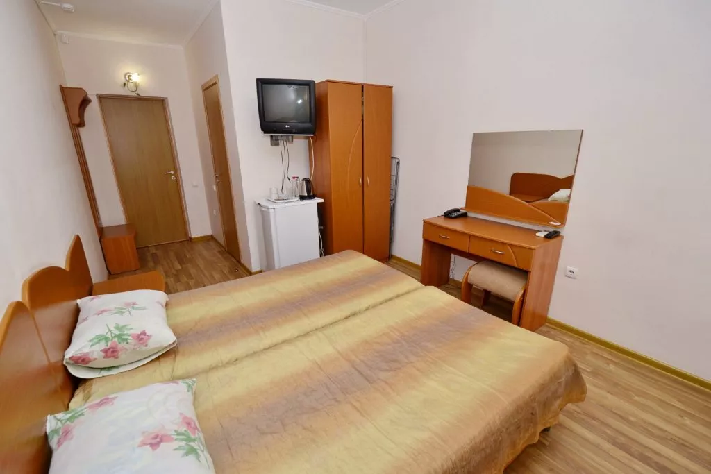 Мебель: односпальные кровати с ортопедическими матрацами, шкаф, тумбочки, стол. Удобства: кондиционер, телевизор, холодильник, фен, посуда.