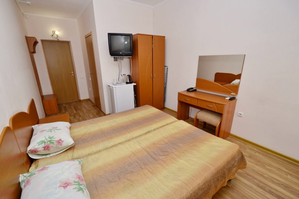 Мебель: односпальные кровати с ортопедическими матрацами, шкаф, тумбочки, стол. Удобства: кондиционер, телевизор, холодильник, фен, посуда.