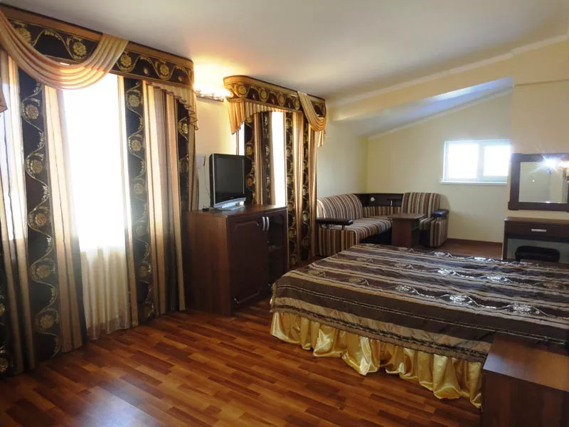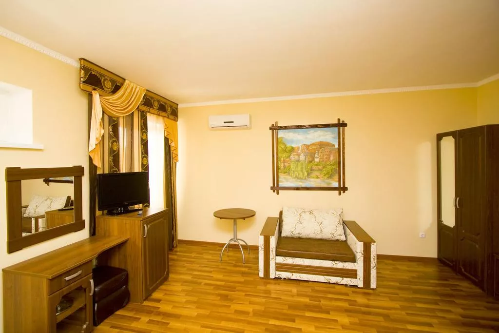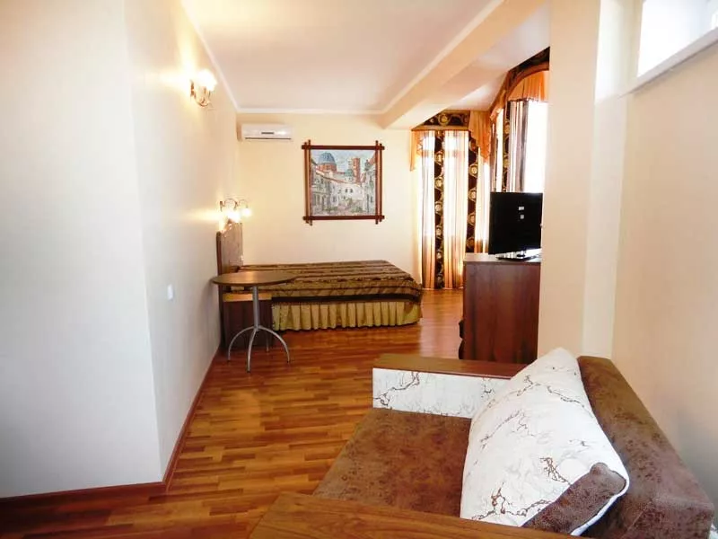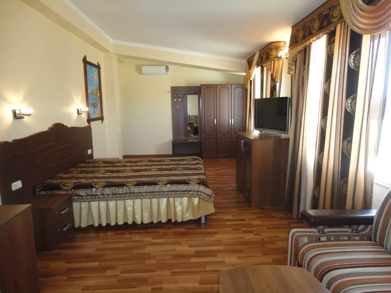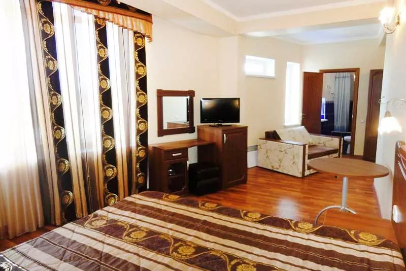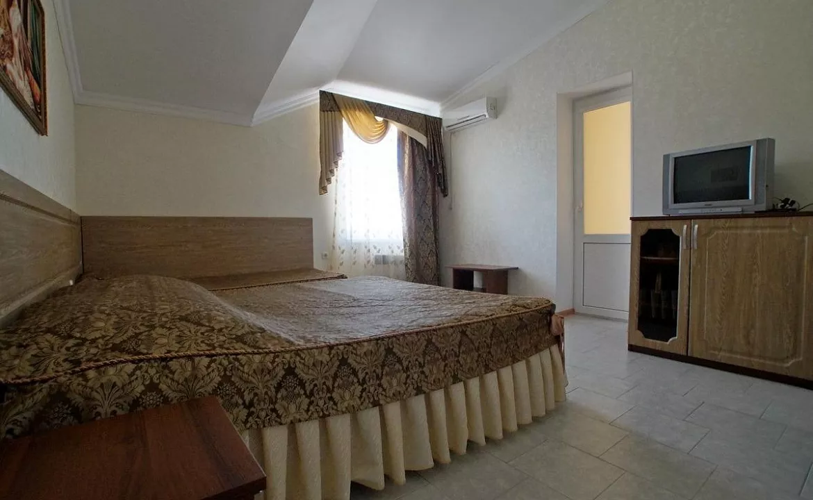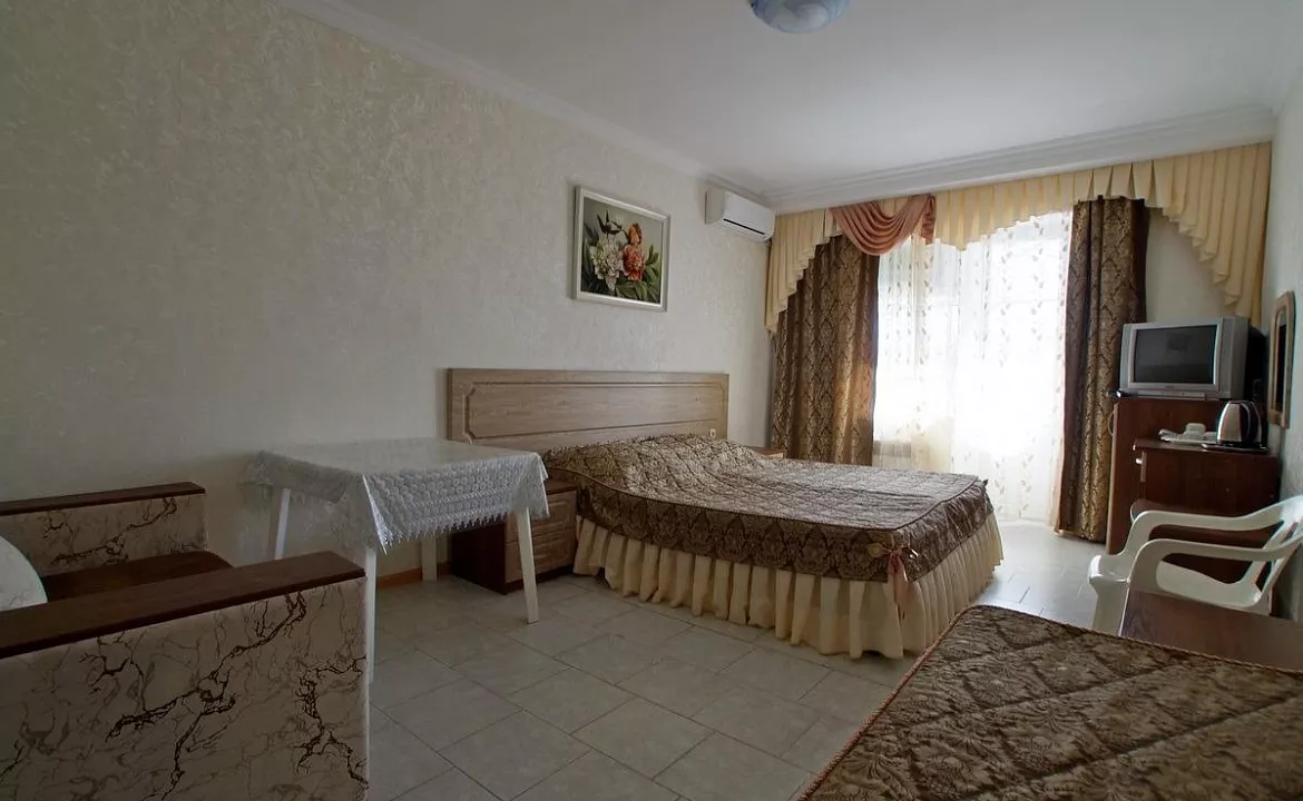 Мебель: односпальные и двуспальная кровати, кресло-кровать, диван-кровать, шкаф, прикроватные тумбочки, журнальный столик. Удобства: кондиционер, холодильник, телевизор, эл. чайник, фен, сейф, Wi-Fi интернет, спутниковое ТВ, СВЧ, посуда, балкон.