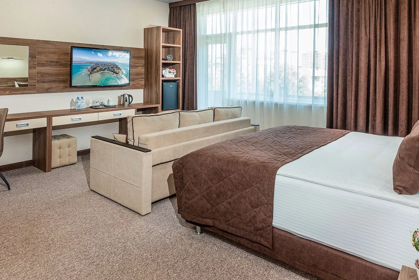 В каждом номере принадлежности для приготовления чая или кофе, сейф, просторный балкон, телевизор с плоским экраном 49", письменный стол, холодильник, фен, гладильная доска, варианты с ванной и душевой кабиной.