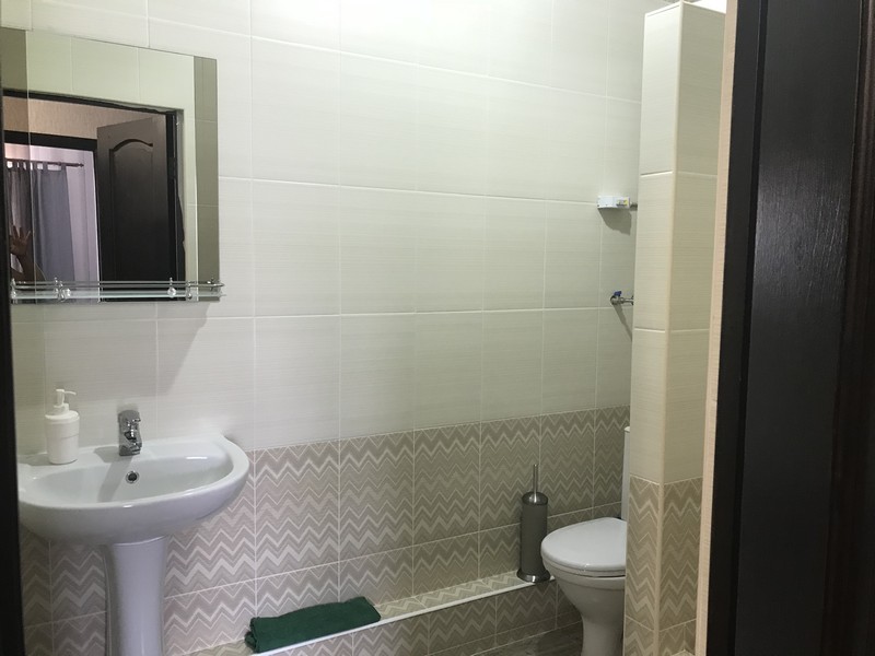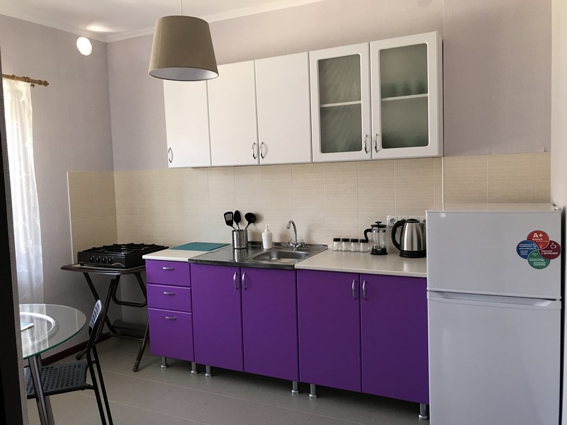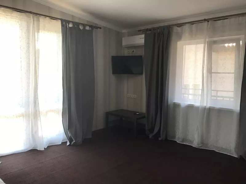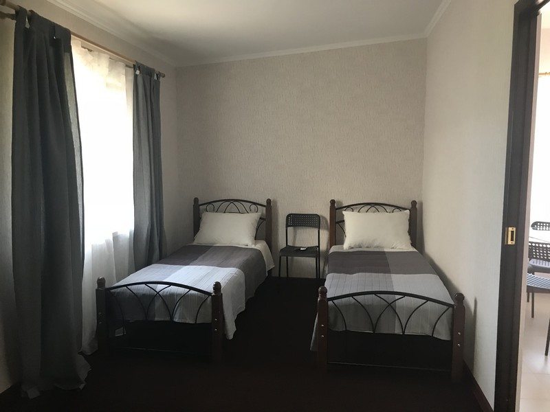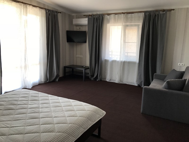 Отличное место для семейного отдыха. Сняли двухкомнатный номер с балконом и кухней на третьем этаже, всё понравилось. Номер чистый, уютный. Машину припарковали во дворе рядом с другими авто. Двор аккуратный с мангальной зоной, бассейном, качелями, батутом, шезлонгами, столиками и стульями. На первом этаже холл с настольным играми. Всё отлично! До Центрального пляжа 11 минут по улице с магазинами, кафе, столовыми. Обязательно приедем ещё !