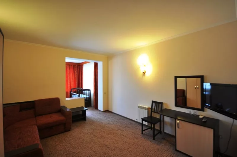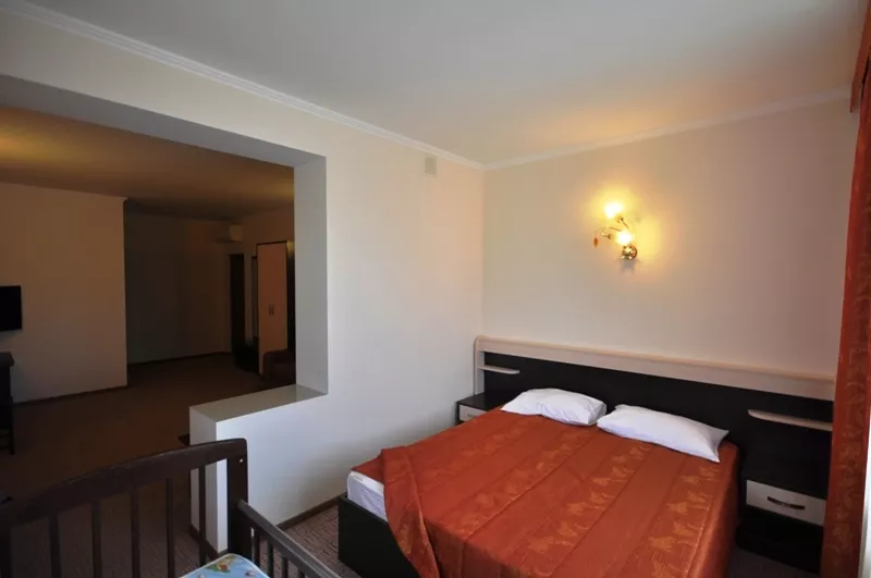 В номере: односпальные или двуспальная кровати, шкаф, прикроватные тумбочки, прихожая, кондиционер, телевизор, холодильник, балкон (наличие уточнять). Душ и туалет в номере.