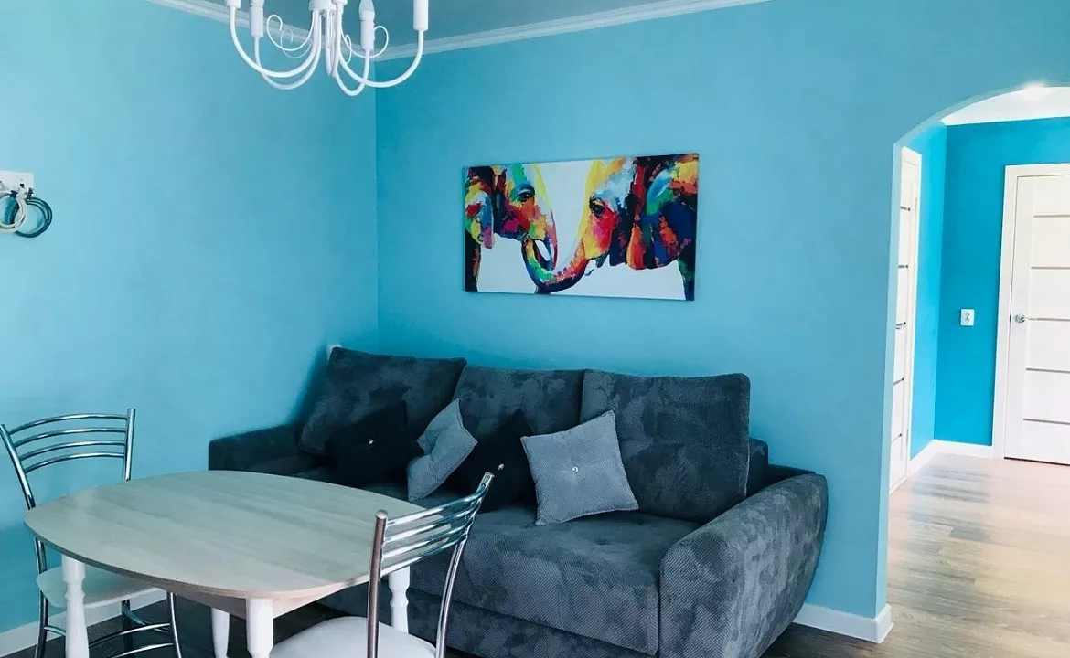 Мебель: двуспальная кровать, диван-кровать, шкаф, стулья, стол, журнальный столик, вешалка, зеркало, кухонный гарнитур, обеденная зона. Удобства:    кондиционер, холодильник, телевизор, СВЧ, электрочайник, электроплита, посуда, цифровое ТВ.