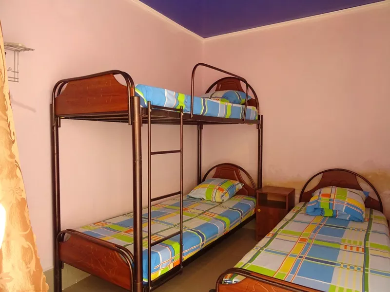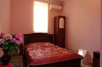Мебель: односпальная или двухъярусная кровати, прикроватные тумбочки, вешалка, зеркало, общая кухня (на 2 номера). Удобства: кондиционер.