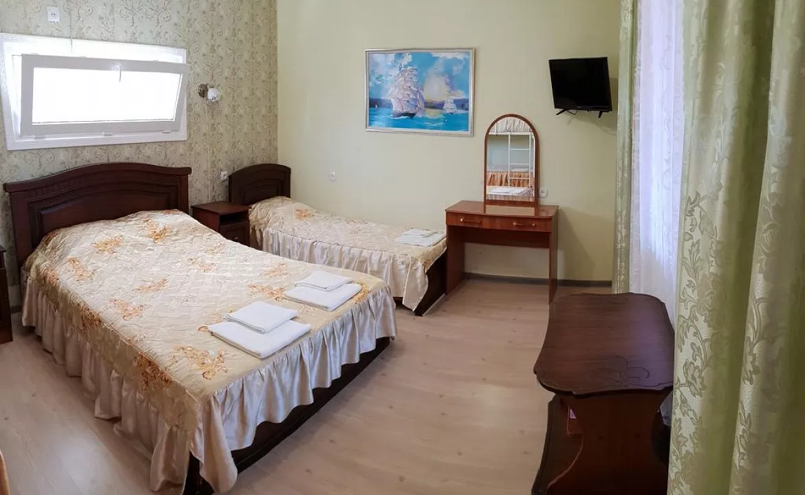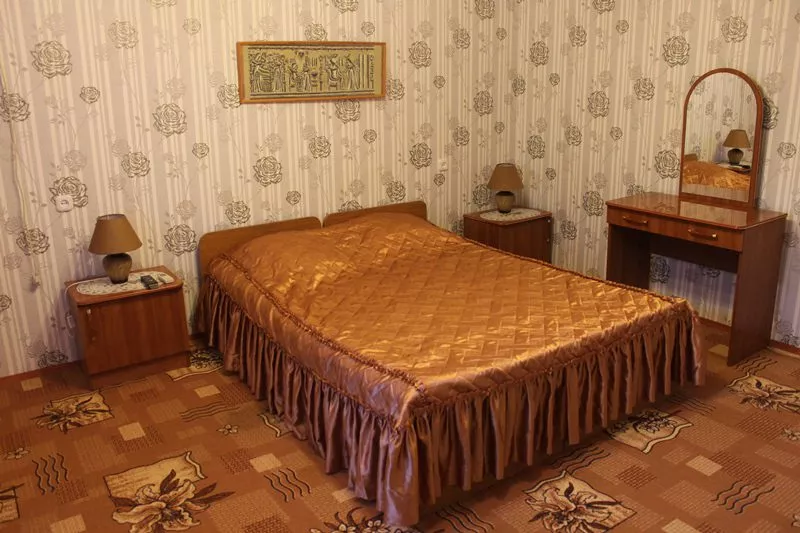 Мебель: односпальные или двуспальная кровати, шкаф, прикроватные тумбочки, стол, стулья, туалетный столик, вешалка, зеркало. Удобства: кондиционер, холодильник, телевизор, посуда.