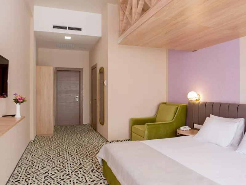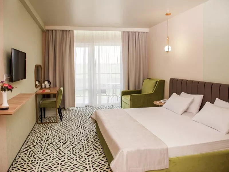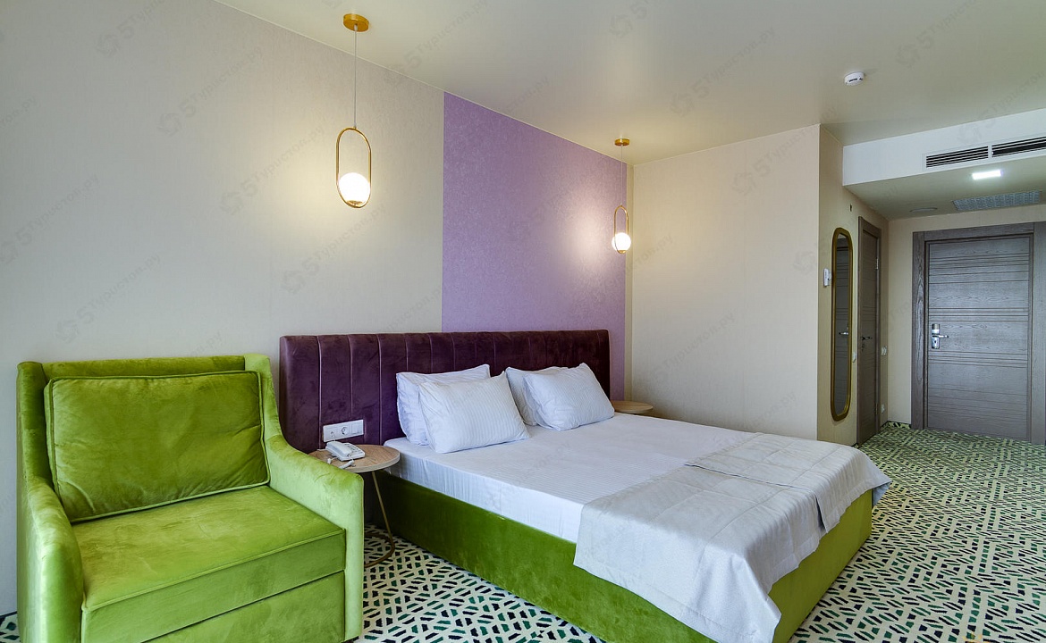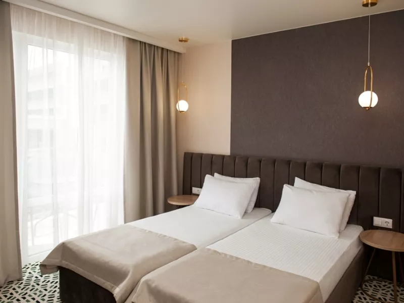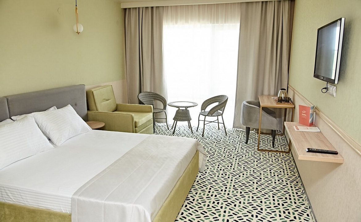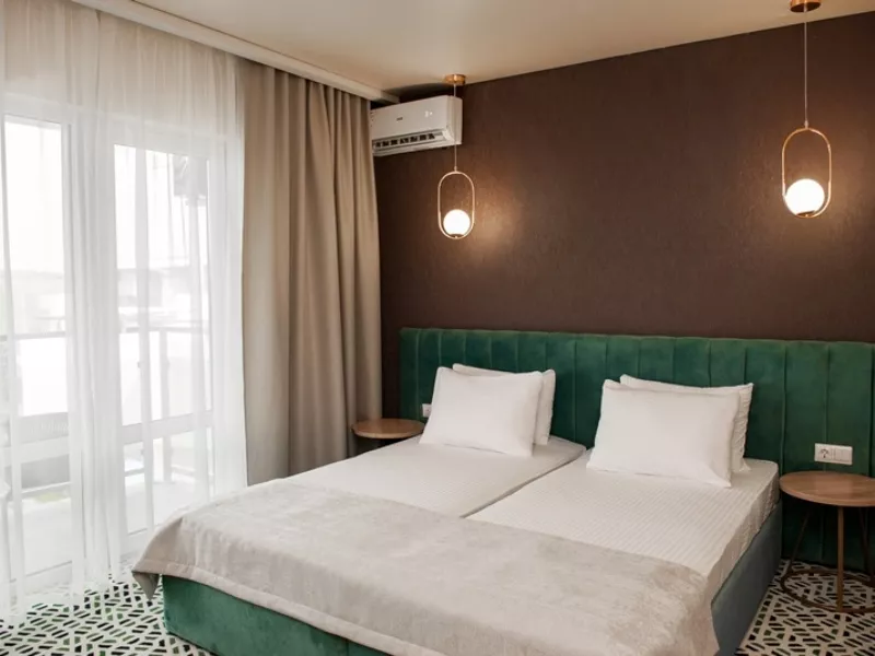 Мебель: односпальные или двуспальная кровати, зеркало. Удобства: сплит-система, холодильник, телевизор, телефон, Wi-Fi интернет, чайная станция, фен, сейф, балкон, уличная мебель, сушилка для белья, душ, раковина, унитаз, банные принадлежности, гостиничная парфюмерия, пляжные полотенца.
