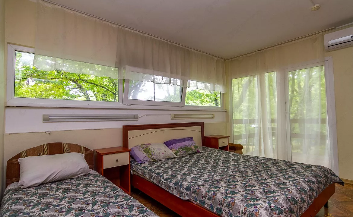Мебель: односпальные и двуспальная кровати, стулья, прикроватные тумбочки, стол, шкаф, прихожая, вешалка, зеркало. Удобства: кондиционер, телевизор, цифровое ТВ, холодильник, эл. чайник, балкон с видом на лес.