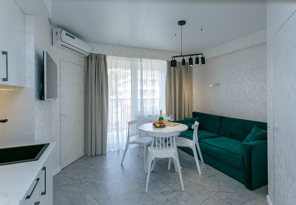 Современный апартамент с видом на море на первой линии, всего в двух минутах ходьбы от пляжа и в 15 минутах от центра Сочи.