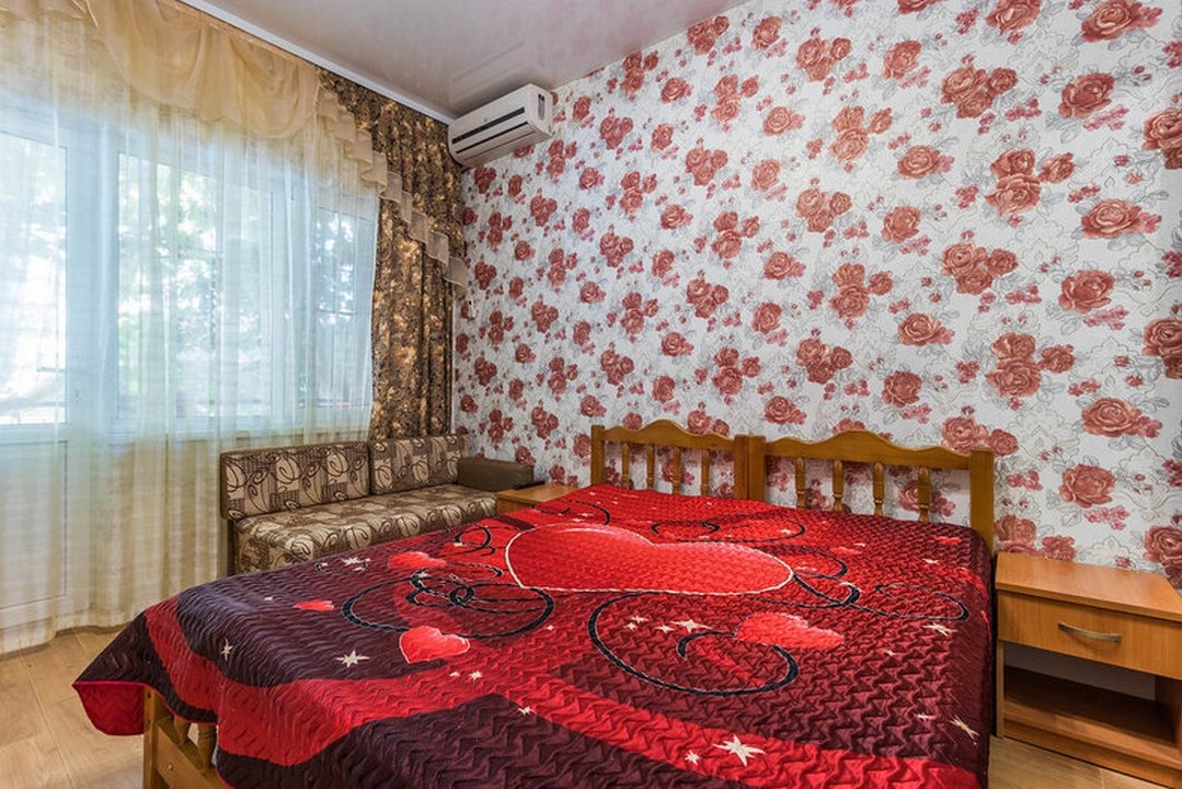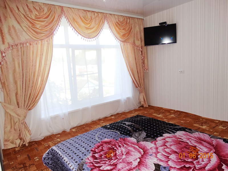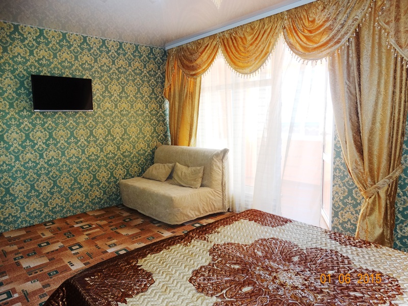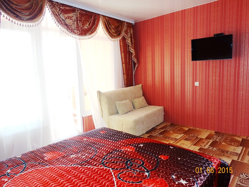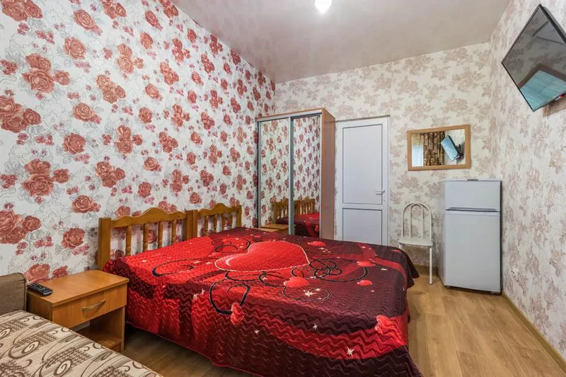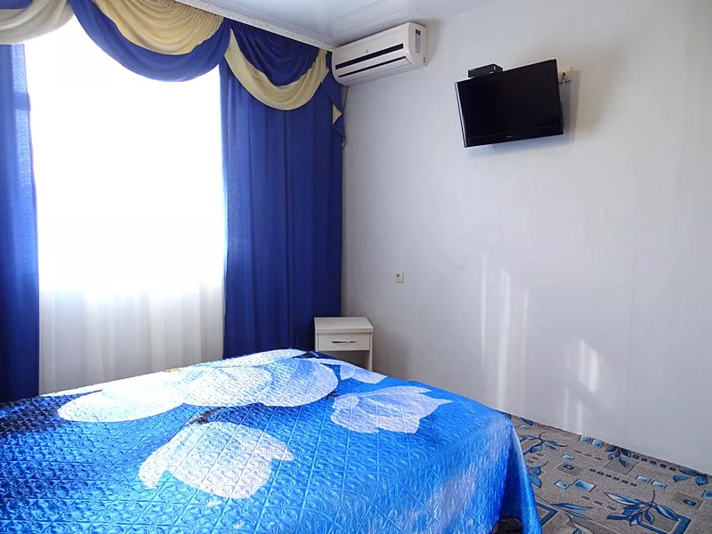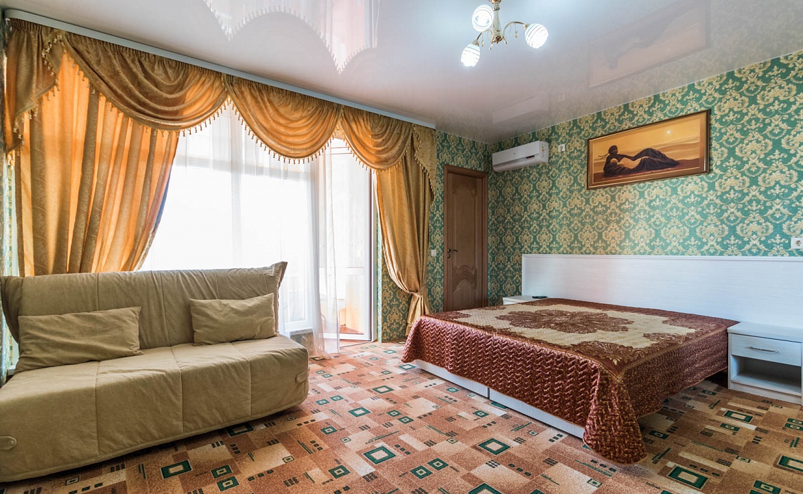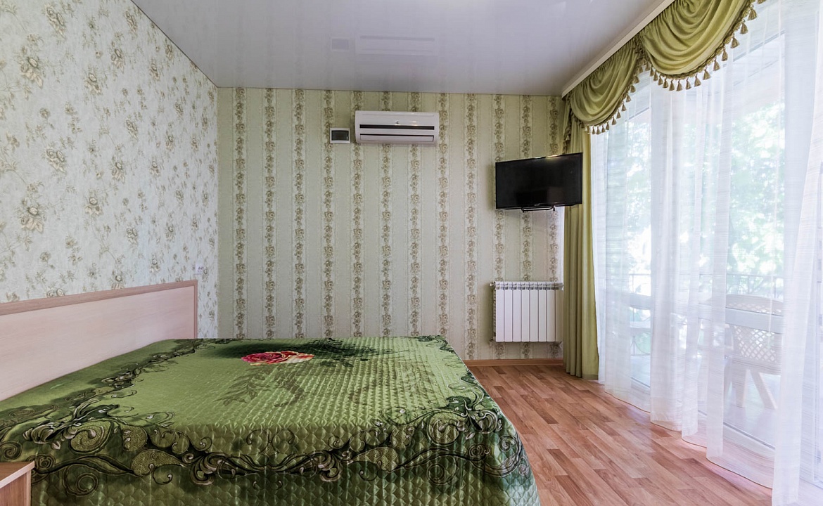 Мебель: двуспальная кровать, кресло-кровать, шкаф, стулья, прикроватные тумбочки, трельяж, столик и кресла на балконе. Удобства: кондиционер, холодильник (в номерах на 1 этаже), телевизор, эл. чайник, СВЧ, посуда, балкон, интернет.