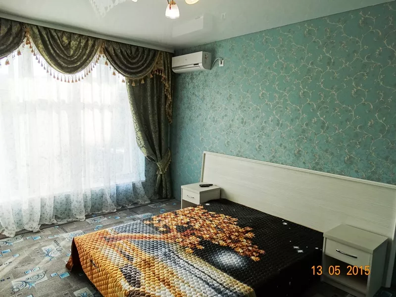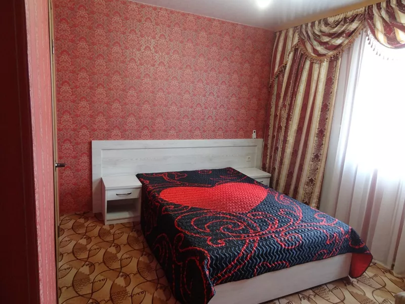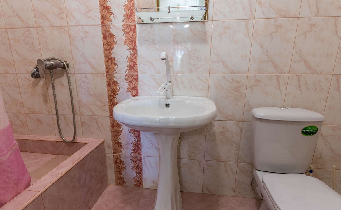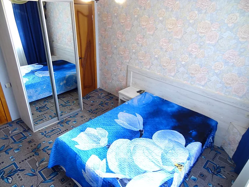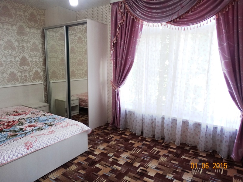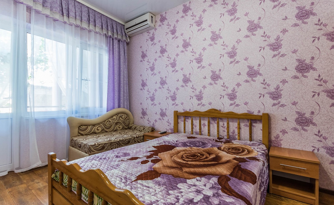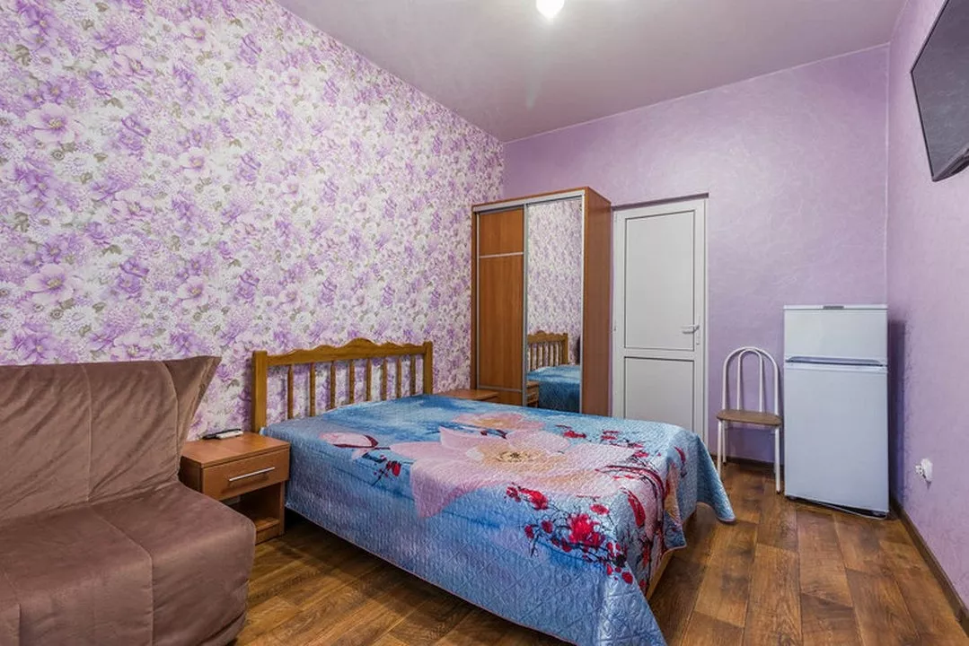 Мебель: двуспальная кровать, кресло-кровать, шкаф, стулья, прикроватные тумбочки, трельяж, столик и кресла на балконе. Удобства: кондиционер, холодильник (в номерах на 1 этаже), телевизор, эл. чайник, СВЧ, посуда, балкон, интернет.