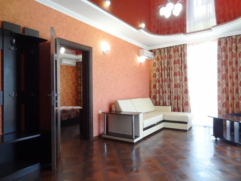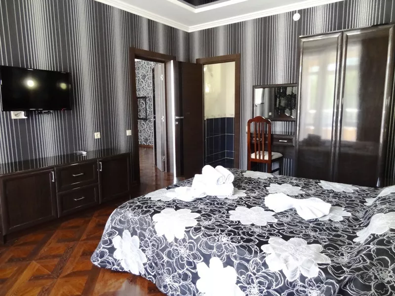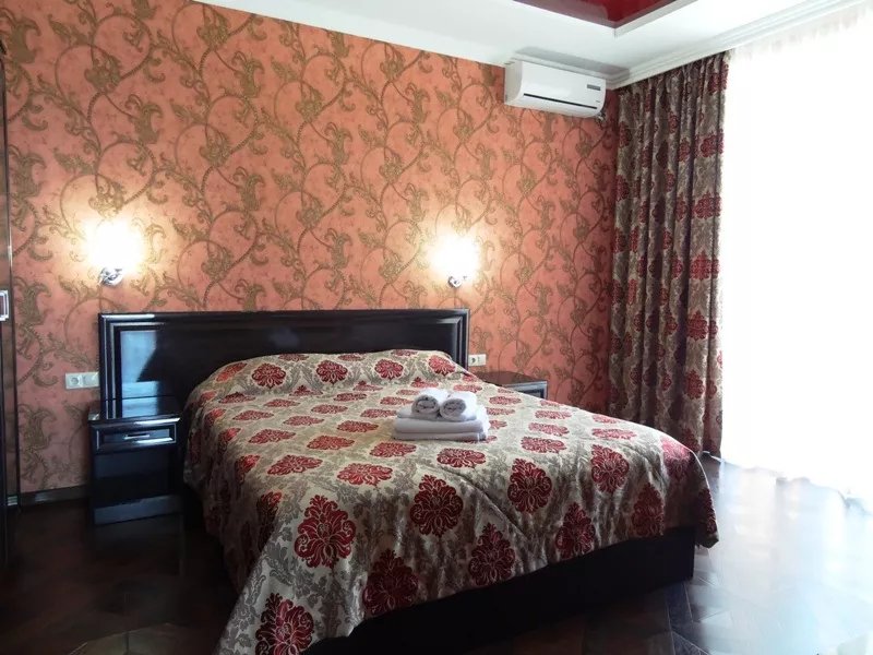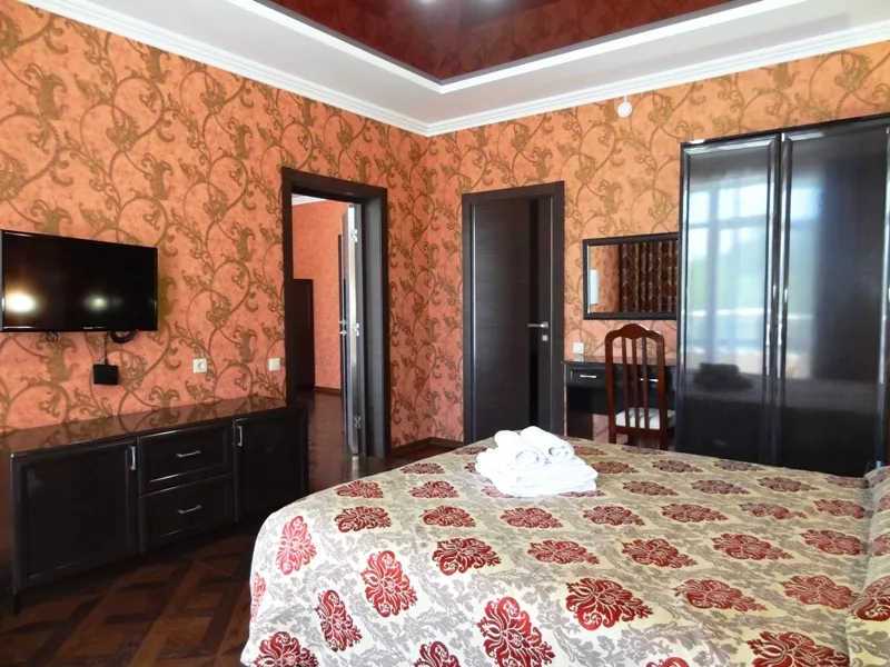 Мебель: двуспальная кровать, диван-кровать, кресло-кровать, шкаф, стулья, прикроватные тумбочки, журнальный столик, туалетный столик, зеркало. Удобства: кондиционер (2 шт.), телевизор (2 шт.), холодильник, телефон, 3 балкона с видом на море.