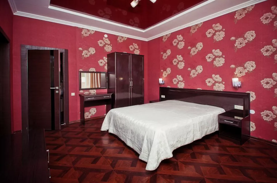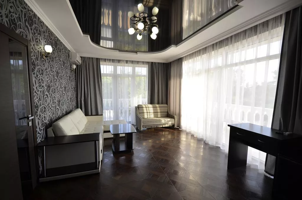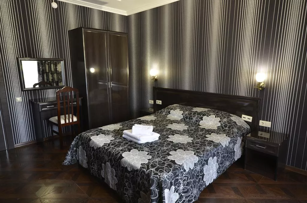 Мебель: двуспальная кровать, диван-кровать, кресло-кровать, шкаф, стулья, прикроватные тумбочки, туалетный столик, зеркало. Удобства: кондиционер, телевизор, холодильник, телефон.