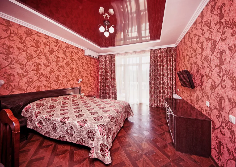 Мебель: двуспальная кровать, диван-кровать, шкаф, стулья, прикроватные тумбочки, журнальный столик, туалетный столик, зеркало. Удобства: кондиционер, телевизор, холодильник, телефон, балкон.