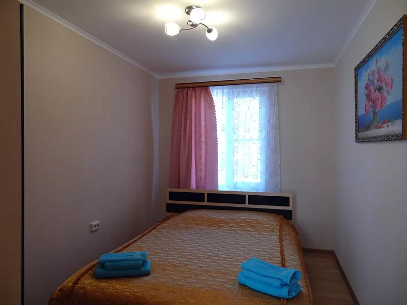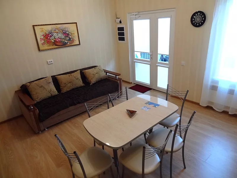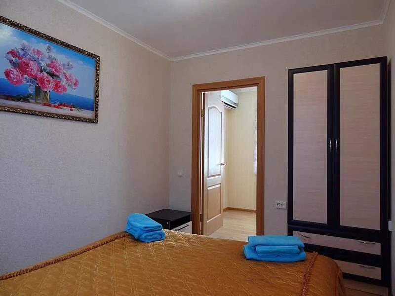 Мебель: односпальные или двуспальная кровати, диван-кровать, шкаф, стулья, прикроватные тумбочки, стол, прихожая, вешалка, зеркало, кухонный гарнитур, обеденная зона. Удобства: сплит-система, телевизор, холодильник, эл. чайник, СВЧ, посуда, интернет.