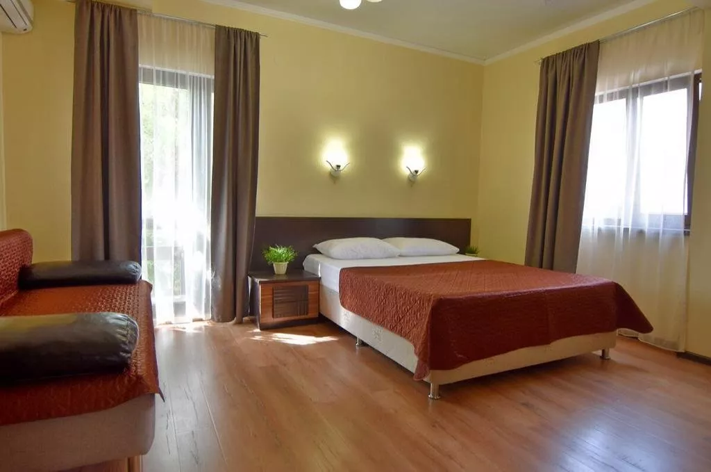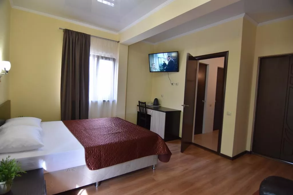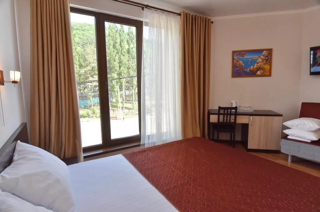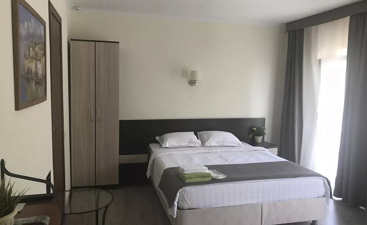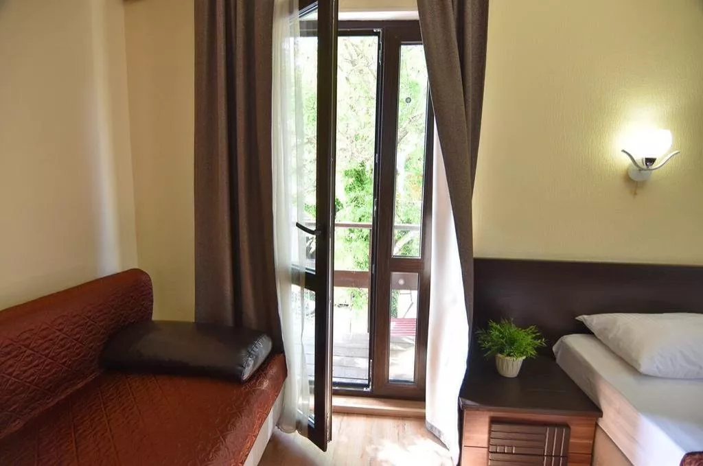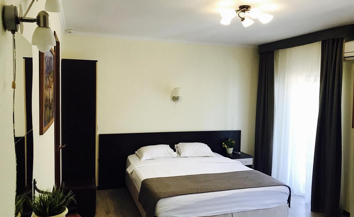 Тихий теневой номер, на 2-3 человека, с балконом во внутренний дворик, видно горы и море. ТВ 20 цифровых каналов. Набор посуды: ложки, вилки, тарелки, эл. чайник, мини-холодильник.