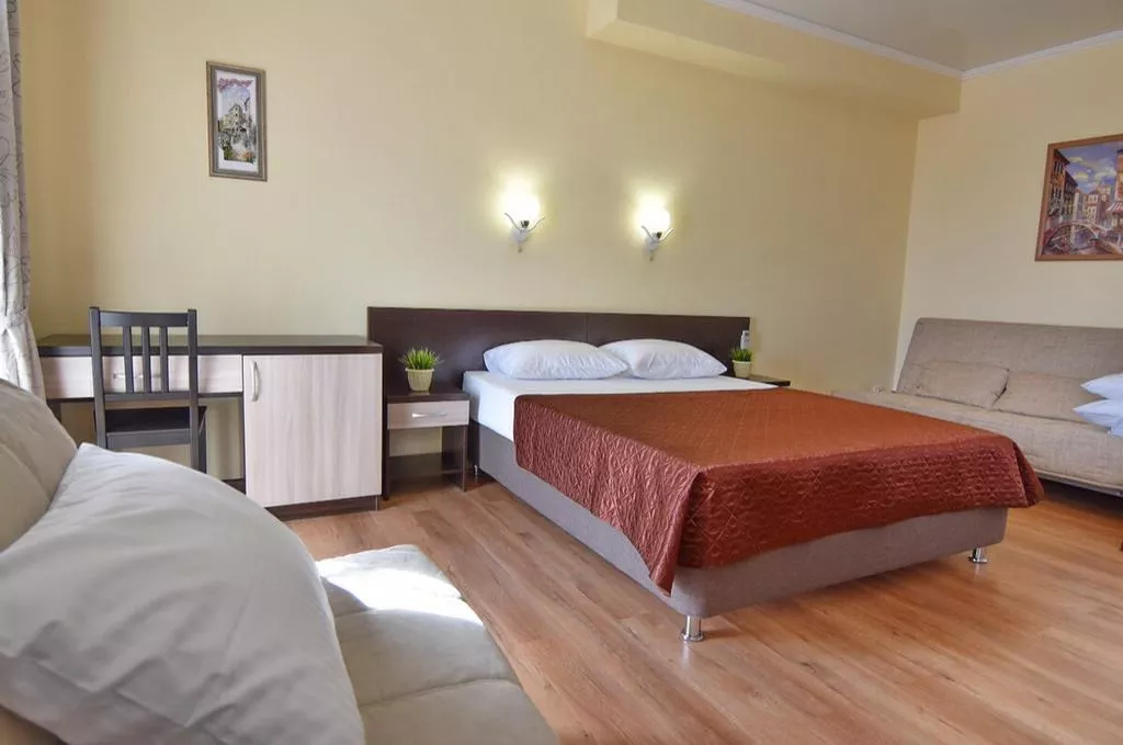 Cамый большой и просторный номер, на 3-5 человек, с мини-кухней, с балконом и видом на море. ТВ со спутниковыми каналами. Набор посуды: ложки, вилки, тарелки, эл. чайник, мини-холодильник.