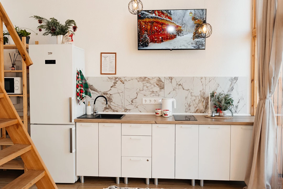 Полностью оснащенная кухня, для приготовления пищи, а также мы расскажем, где можно у нас вкусно покушать