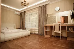 Улучшенный однокомнатный номер для двоих гостей. Душ, туалет, фен, шкаф с зеркалом в полный рост, холодильник, чайник, стол, стул, двуспальная кровать, большой плоский телевизор, кондиционер