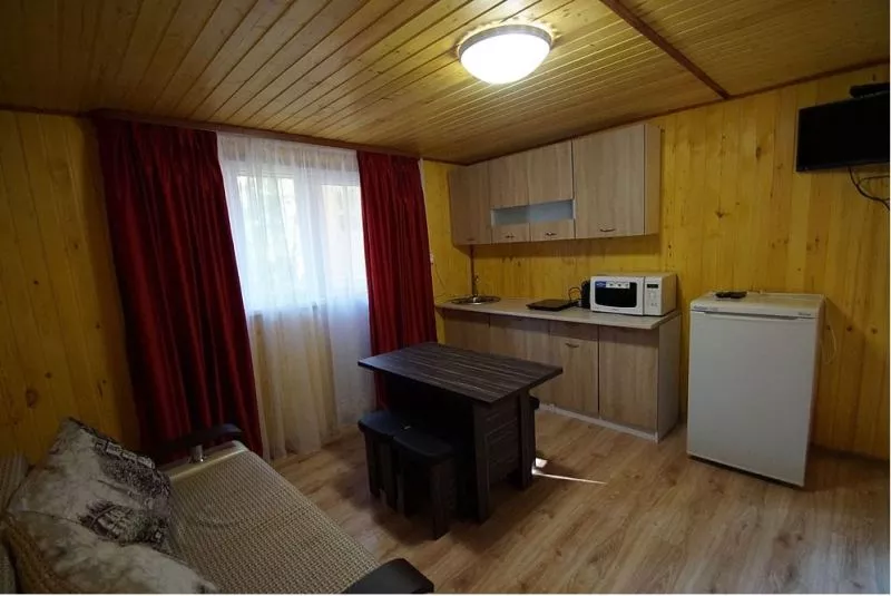 Мебель: односпальные и двуспальные кровати, прикроватные тумбочки, платяной шкаф, сейф, посуда, кухонный гарнитур, обеденная зона. Удобства: кондиционер, холодильник, спутниковое ТВ, СВЧ, эл. чайник, фен, балкон.