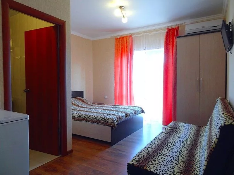 Мебель: двуспальная кровать, диван-кровать, шкаф, стулья, прикроватные тумбочки, журнальный столик, зеркало. Удобства: сплит-система, телевизор, интернет, холодильник, фен, балкон (наличие уточнять).