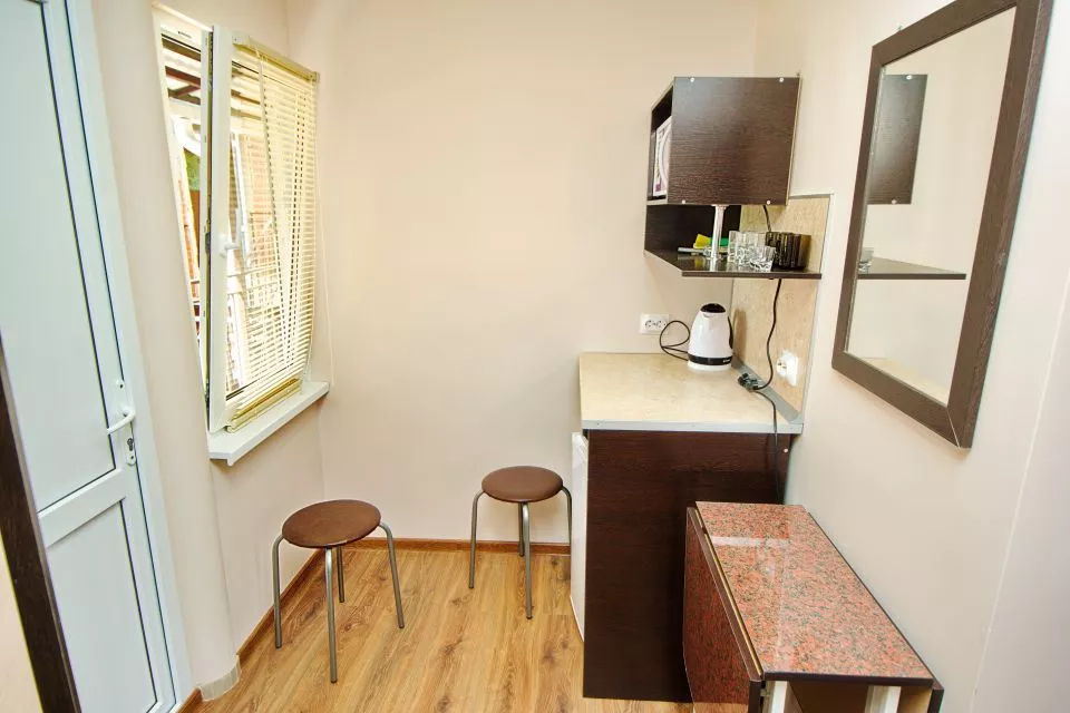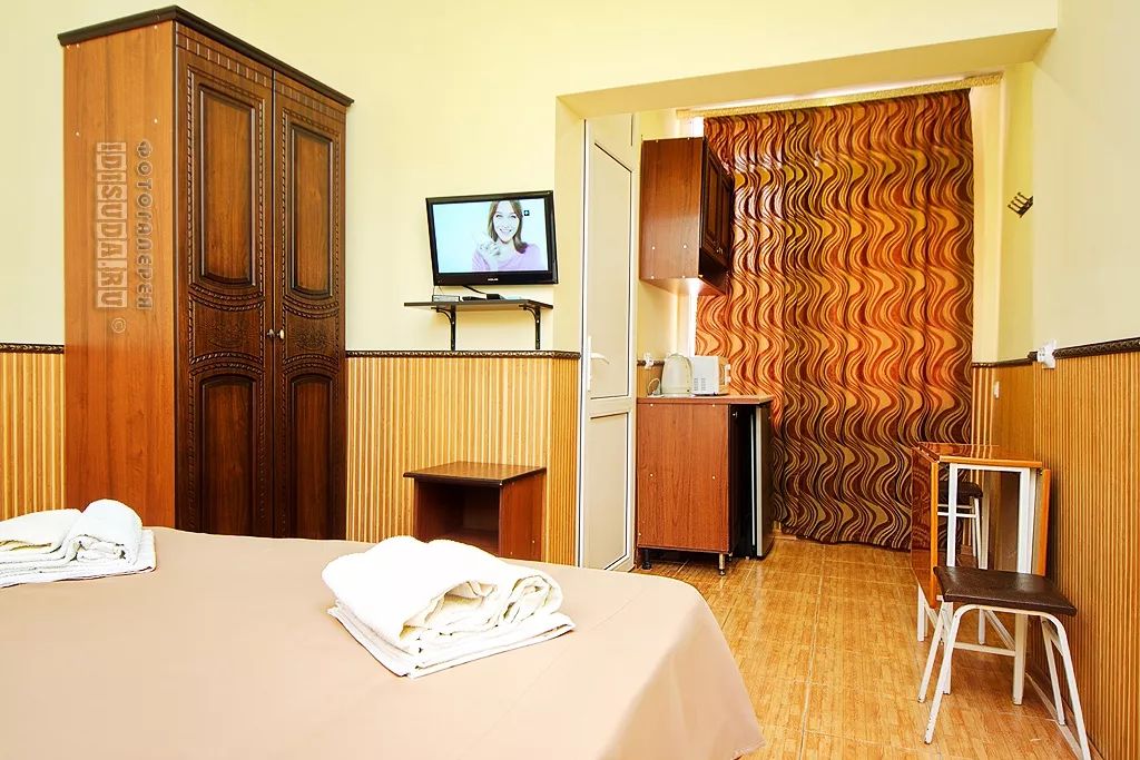 На территории гостевого дома имеется бассейн c подогревом для купания взрослых и детей, лежаки для отдыха и детская площадка.  Для комнат 1 этажа во внутреннем дворике имеются лавочки для отдыха и столики. Общая кухня со столовой зоной для самостоятельного приготовления пищи расположена на 2 этаже, оборудована всеми необходимыми кухонным принадлежностями, столами и стульями для отдыха. По желанию гостей может быть организовано питание (за дополнительную плату).Гостевой дом "Людмила" прекрасно подходит для размещения семейных пар с детьми.Для комфортного отдыха предоставляется детская кроватка (дети до 2 лет бесплатно), детская коляска, стульчик для кормления (на общей кухне), горшок, детские пазлы и книжки.Перед гостевым домом имеется парковка на 10 автомобилей, на которой ведется видеонаблюдение. Также имеется мангал для приготовления шашлыка.Приезжайте к нам в гости и чувствуйте себя как дома!- пляж галечный - 15-20 минут- набережная - 15-20 минут