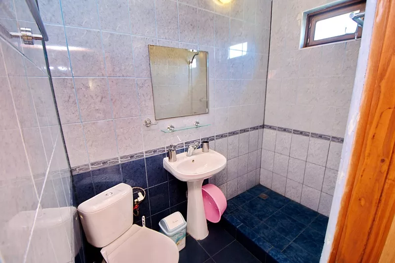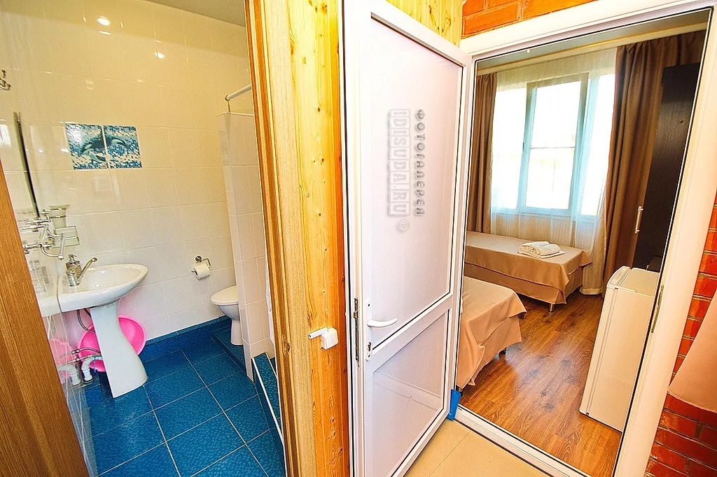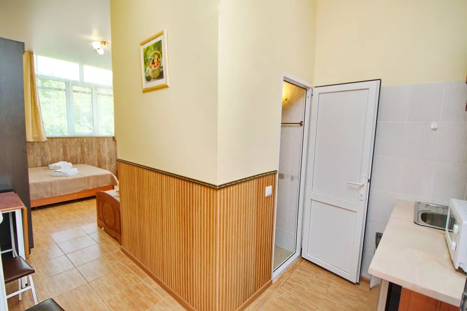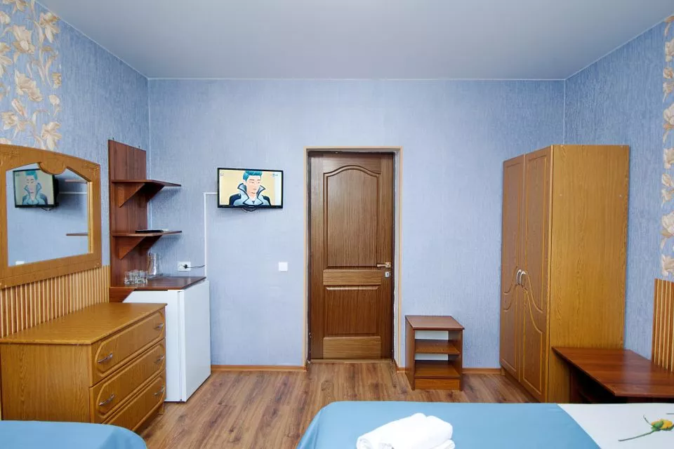 Мебель: двуспальная кровать, двухъярусная кровать, шкаф, прикроватные тумбочки, столик и 2 стула (рядом с номером). Удобства: сплит-система, холодильник, СВЧ, интернет, телевизор, цифровое ТВ, эл. чайник.