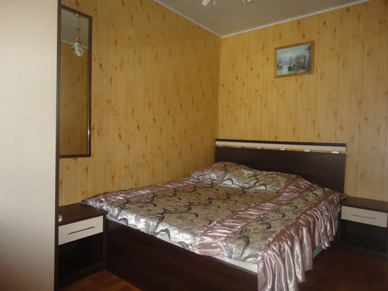 Мебель: двуспальная кровать и односпальный угловой диван, тумбочки прикроватные, туалетный столик с зеркалом, шкаф, обеденный стол, табурет (2 шт.), стол и 2 кресла (на балконе). Удобства:    сплит-система, холодильник, телевизор, цифровое ТВ, интернет, эл. чайник, эл. плита, посуда, балкон.