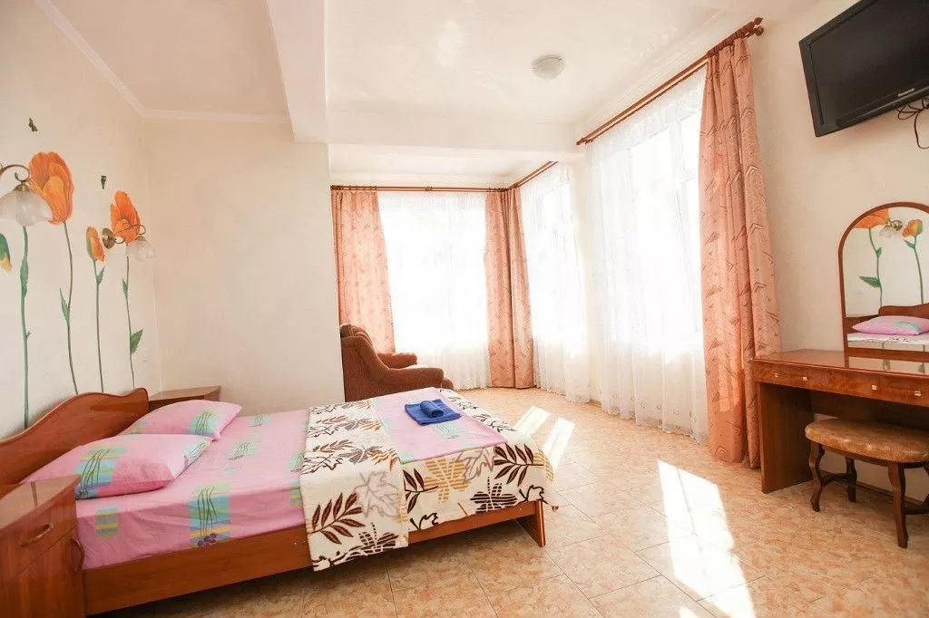 Мебель: односпальные и двуспальная кровати, диван-кровать, кресло-кровать, кресла, шкаф, стулья, пуфики, прикроватные тумбочки, журнальный столик, стол, вешалка, зеркало, кухонный гарнитур, обеденная зона. Удобства: холодильник, телевизор, вентилятор, спутниковое ТВ, СВЧ, эл. чайник, посуда, интернет, фен.