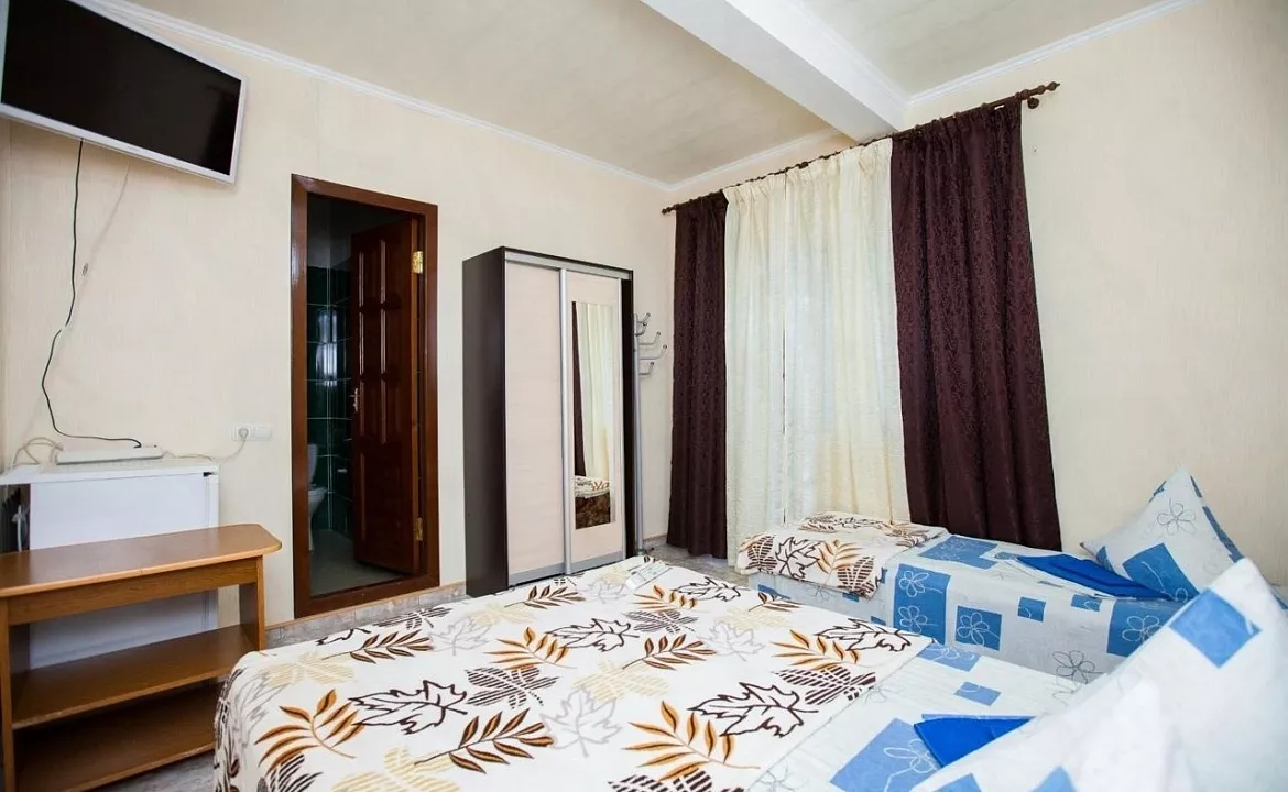 Мебель: односпальные и двуспальная кровати, стулья, шкаф, прикроватные тумбочки, журнальный столик, вешалка, зеркало. Удобства: телевизор, вентилятор, спутниковое ТВ, эл. чайник, посуда, интернет, фен.