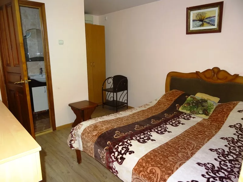 Мебель: односпальные и двуспальная кровати, кресло-кровать, диван-кровать, кресла, шкаф, стулья, прикроватные тумбочки, туалетный столик, комод, прихожая, вешалка, зеркало. Удобства: сплит-система, телевизор, интернет, холодильник, фен, эл. чайник, балкон